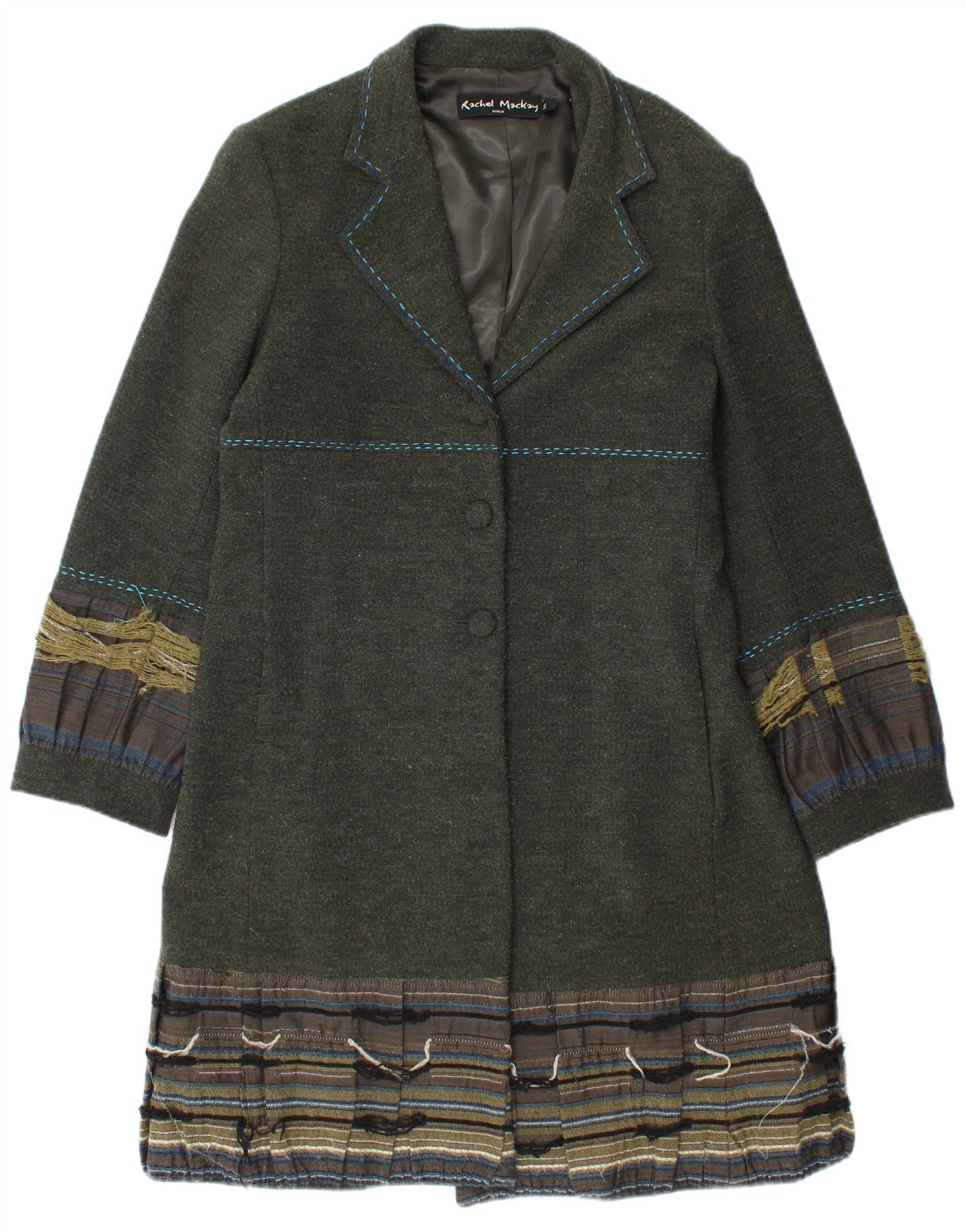 - AI Description: This Rachel Mackay womens coat is crafted from a rich green wool woven fabric. It features a collared neckline and a regular fit. Distinctive blue embroidered stitching highlights the collar and body. The long sleeves and hem are adorned with unique striped panels. A button-up front completes the design. This lined coat includes practical pockets, offering a bespoke designer touch.