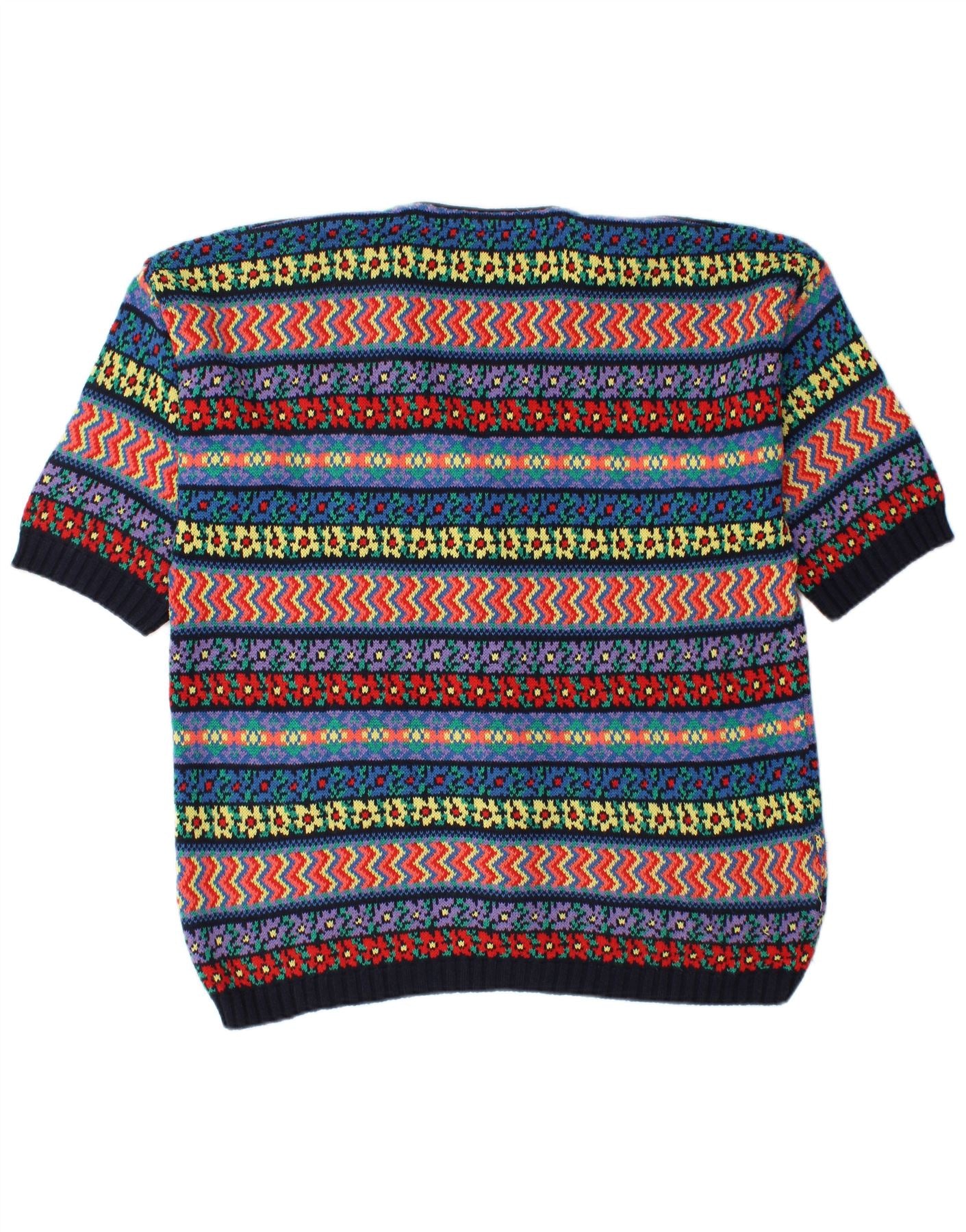 - AI Description: This Vintage womens cardigan sweater is crafted from a comfortable cotton acrylic knit blend. It features a vibrant multicoloured Fair Isle pattern, creating a crazy, retro design. The V-neckline and short sleeves offer a distinctive silhouette. A full button-up front provides classic closure. The regular fit ensures comfort and ease of wear. Tonal buttons complete the detailed look.