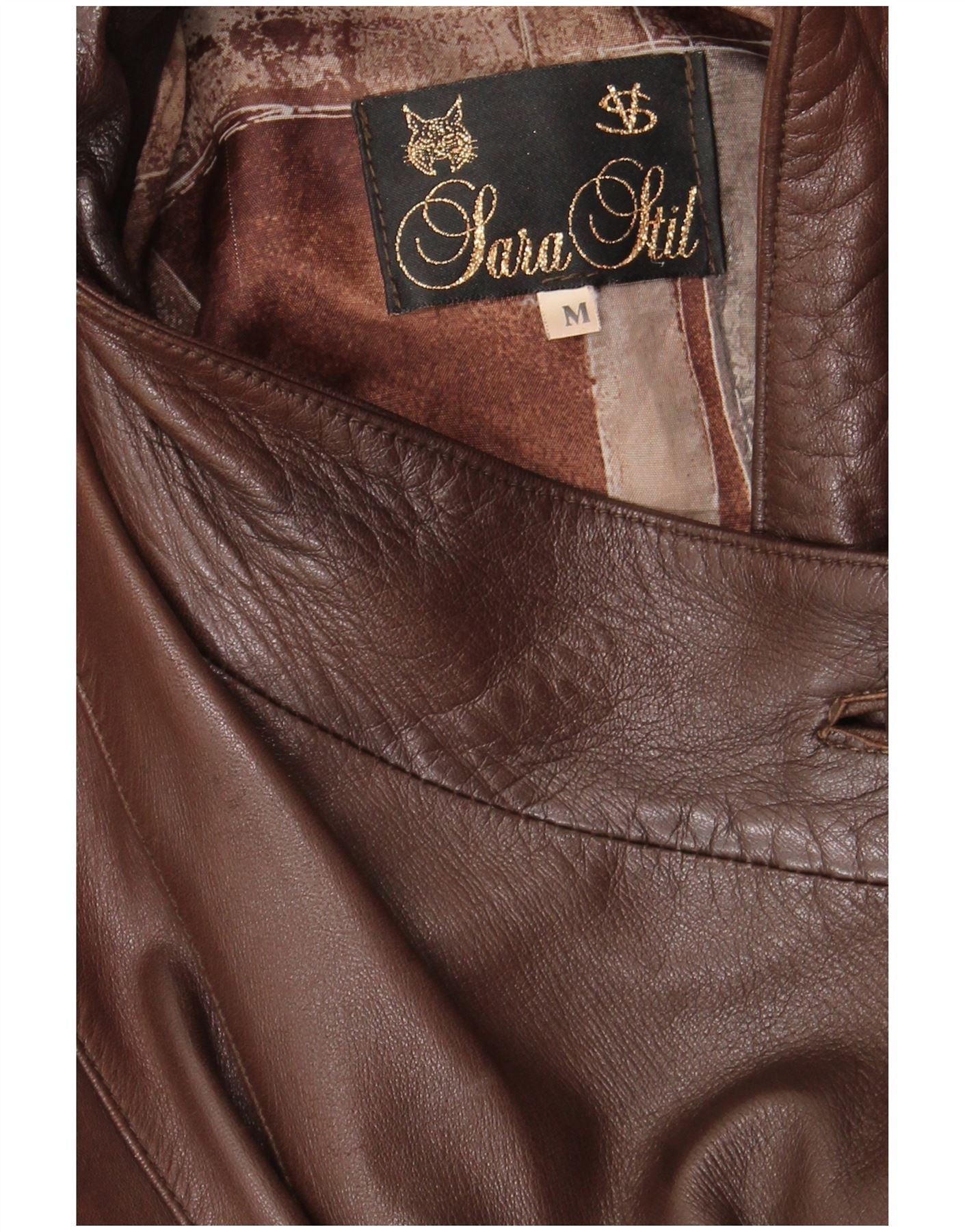 - AI Description: This Sara Stil womens leather jacket is crafted from rich brown leather, offering a smooth yet textured finish. It features a high neck and long sleeves. The regular fit provides comfortable wear. A button-up front with three buttons creates a clean closure. Subtle panel detailing adds structure. Practical pockets are integrated into the design. The jacket is fully lined for added comfort. Its retro style offers a distinctive, timeless appeal.