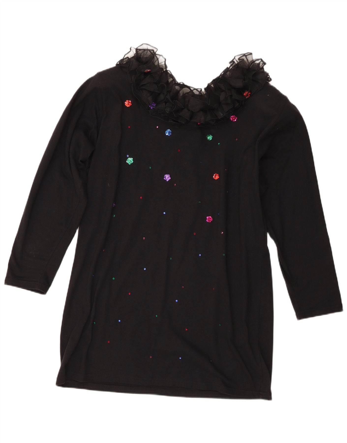 Vintage Womens Ruffle Front Long Sleeve Tunic Top UK 16 Large Black Cotton
