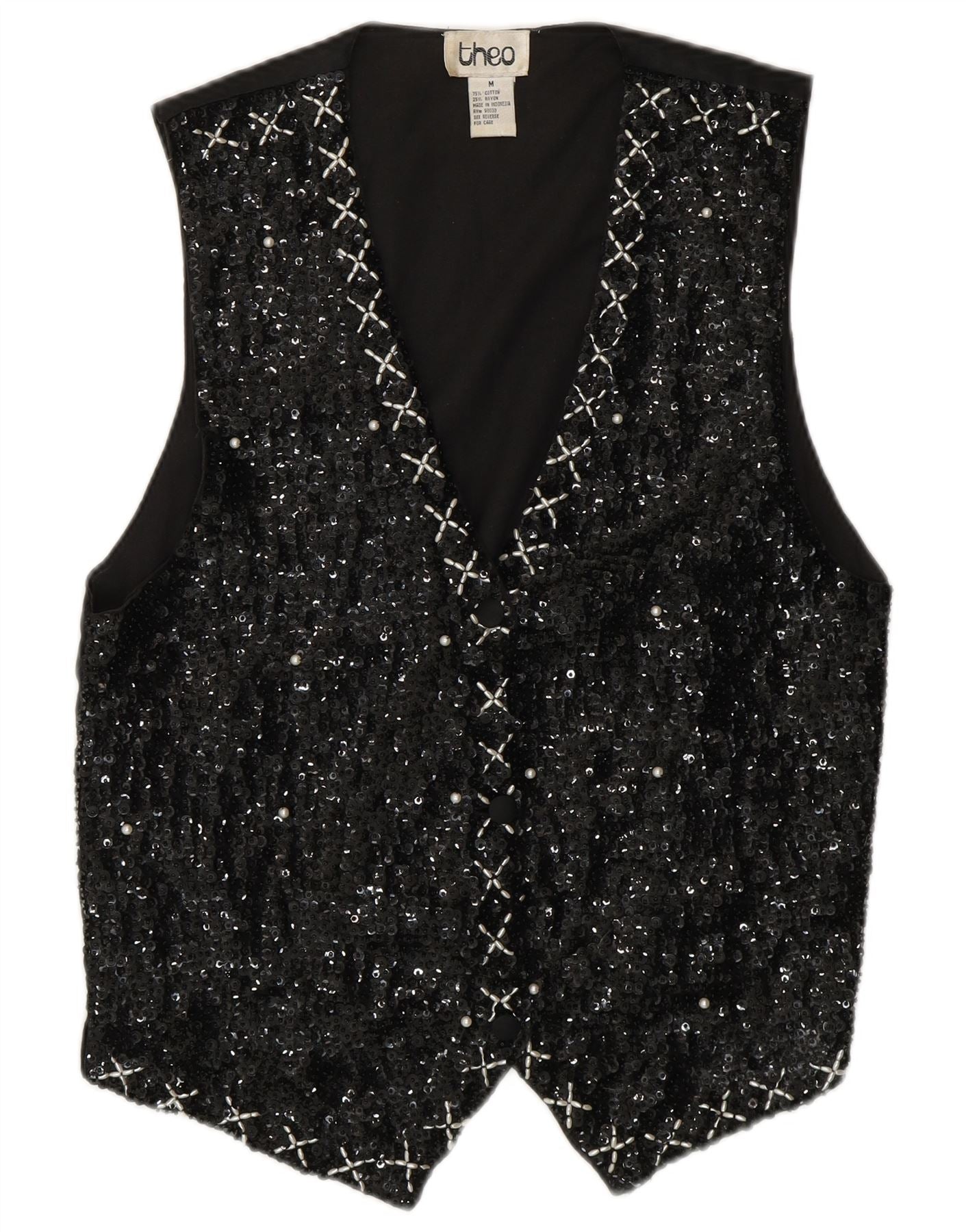 VINTAGE Womens Sequin Waistcoat UK 14 Medium Black Cotton 80s