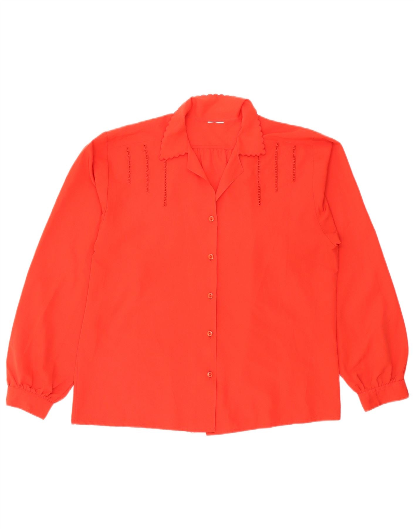 - AI Description: This Vintage womens Blouse Top comes in a vibrant red woven fabric. It features a collared neckline with delicate scalloped detailing. Long sleeves finish with neat buttoned cuffs. A full button-up front ensures a classic closure. The regular fit offers comfortable wear. Subtle vertical stitching accents the front, adding refined texture.