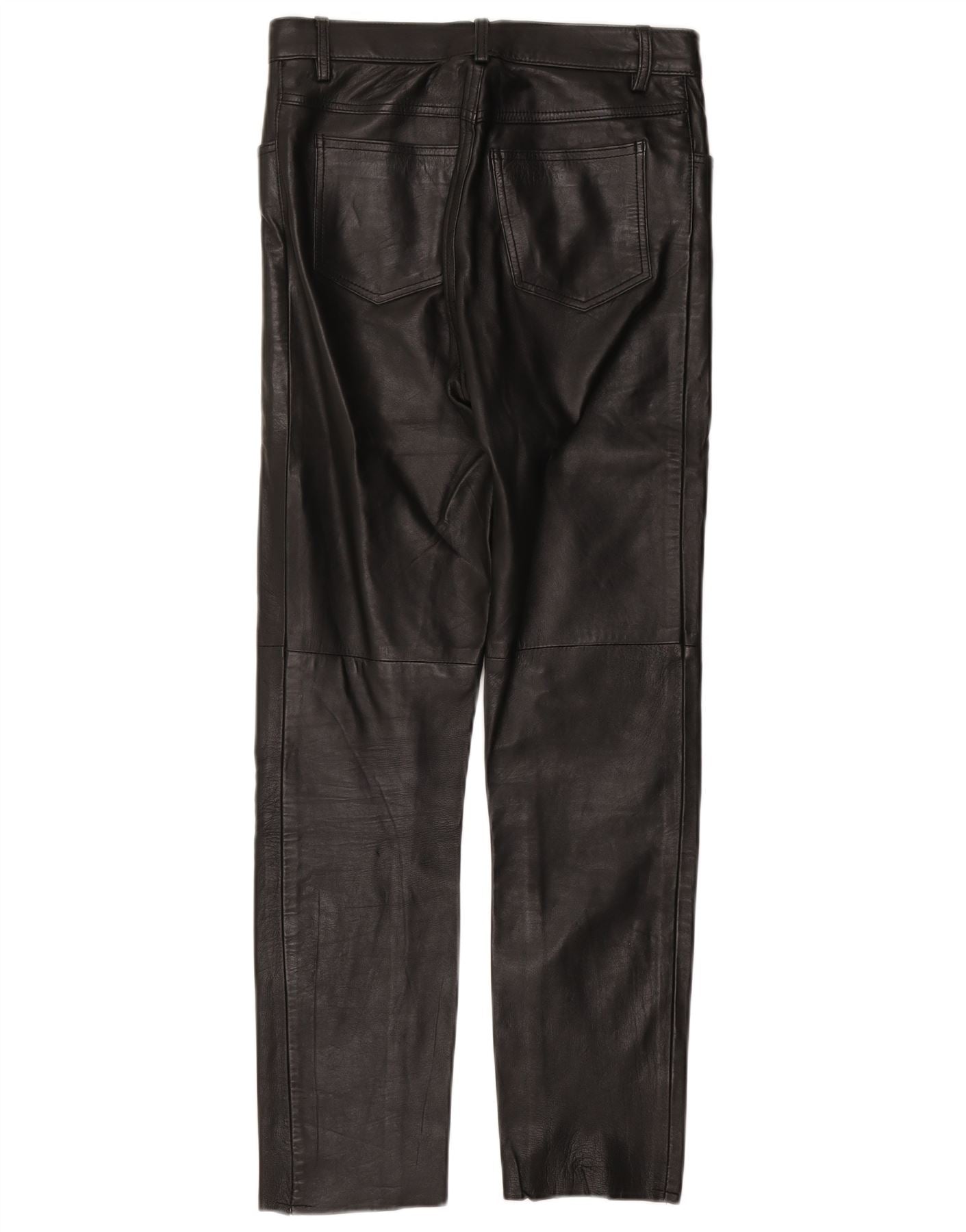 - AI Description: These Vintage womens faux leather trousers are crafted from sleek black faux leather, offering a smooth, supple texture. They feature a regular fit with straight legs for a classic silhouette. A zip closure ensures a neat front. Practical pockets are included for functionality. The biker style adds an edgy, contemporary feel.