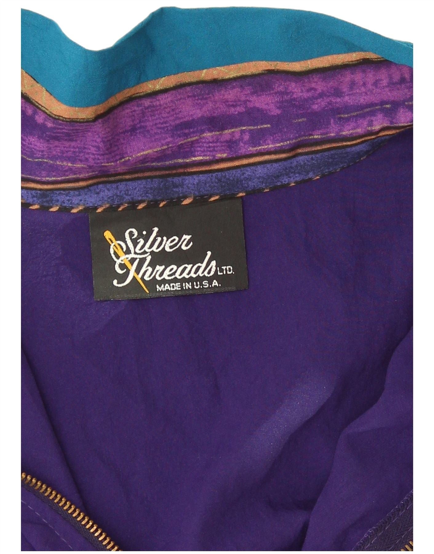 - AI Description: This Vintage womens windbreaker jacket is crafted from a woven fabric, offering a smooth yet durable feel. It features a high neck and long cuffed sleeves. The full zip closure runs down the front. A vibrant colourblock design combines purple with striking blue and turquoise panels. These panels showcase an intricate, abstract pattern. Practical pockets are included. The regular fit ensures comfortable wear.
