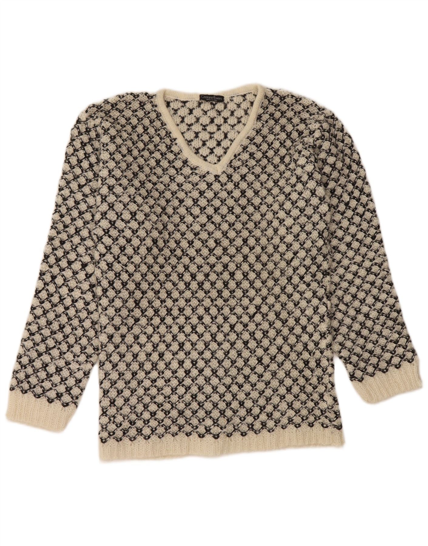 Vintage Womens V-Neck Jumper Sweater UK 14 Medium Off White Geometric