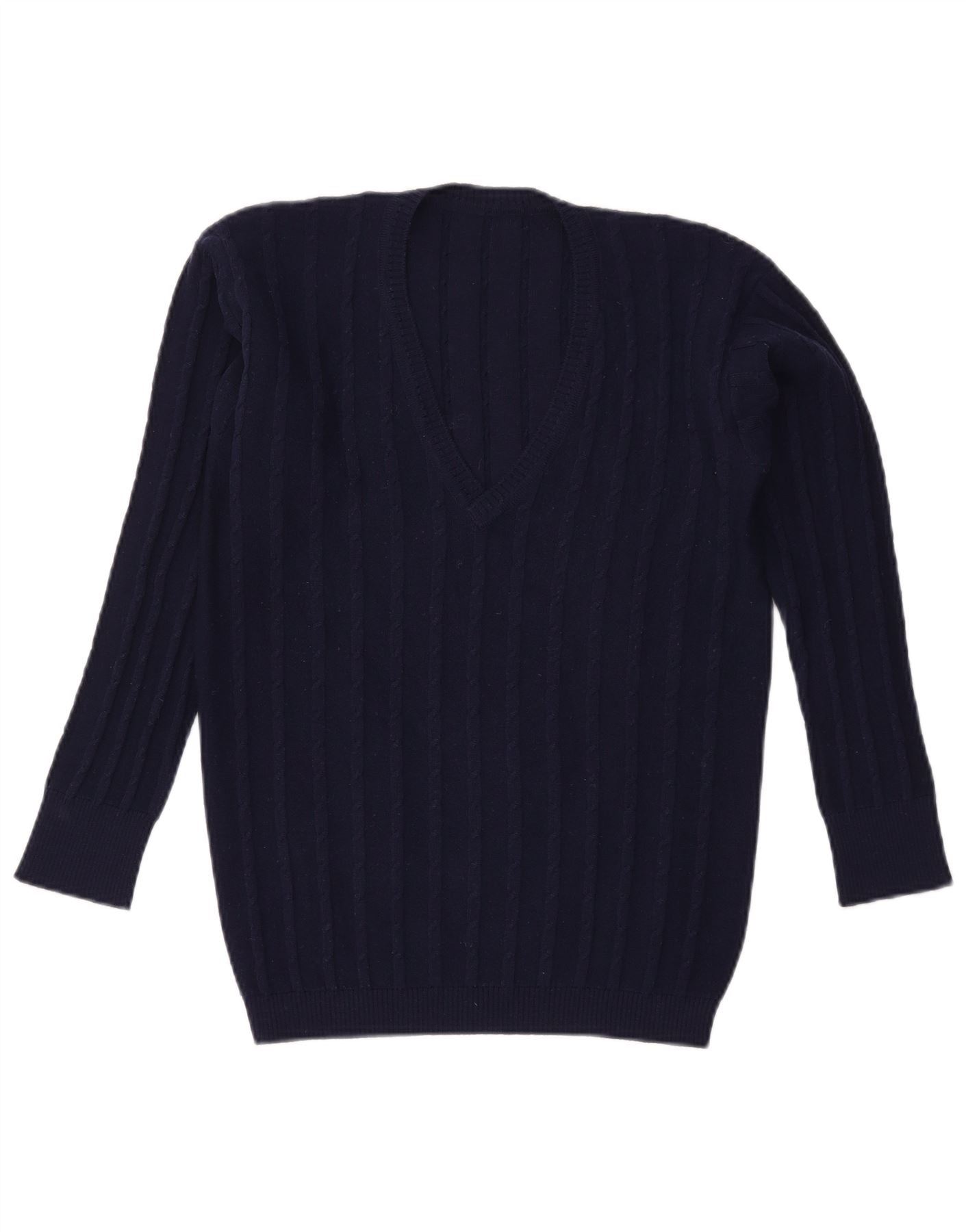 - AI Description: This Vintage womens V-Neck Jumper Sweater is crafted from a soft navy blue knit fabric. It features a classic V-neckline and long sleeves, offering a timeless silhouette. The ribbed knit texture adds subtle visual interest and depth to the garment. Designed for a regular fit, this pullover sweater provides comfortable wear and versatile styling. Its clean lines and simple structure make it an essential wardrobe piece.