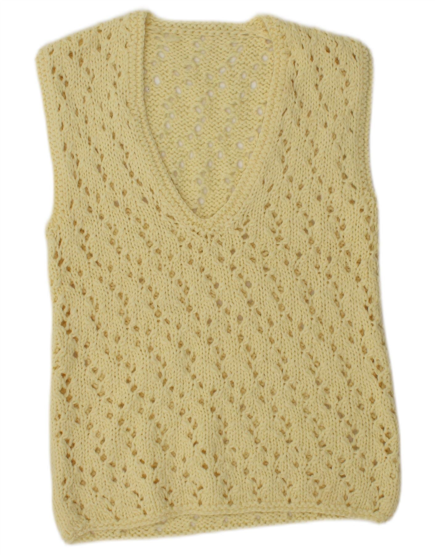 - AI Description: This Vintage womens waistcoat is crafted from a lightweight knit fabric in a soft yellow hue. It features a classic V-neckline and a sleeveless design. An abstract open-knit pattern provides a delicate, breathable texture. The pullover style offers effortless layering. Its regular fit ensures comfortable wear. This retro-inspired piece is both comfortable and stylish, perfect for adding a touch of vintage charm.