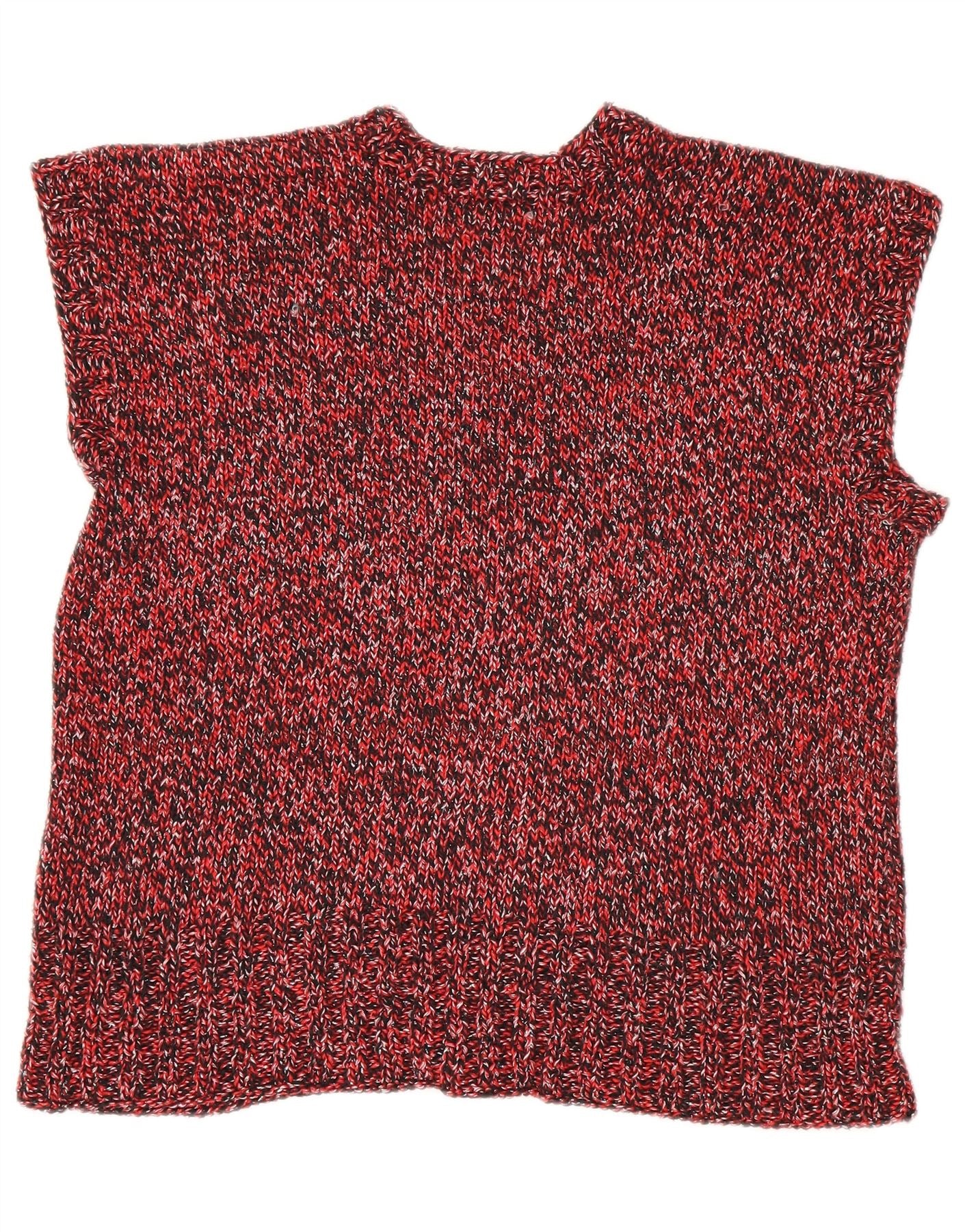 - AI Description: This Vintage womens waistcoat is crafted from a comfortable knit fabric. It features a multicoloured flecked pattern, blending shades of red, black, and burgundy. The sleeveless design and round neck offer a classic, versatile silhouette. It has a regular fit for comfortable wear. This pullover style waistcoat provides a stylish layering option with its distinctive texture and colour blend.