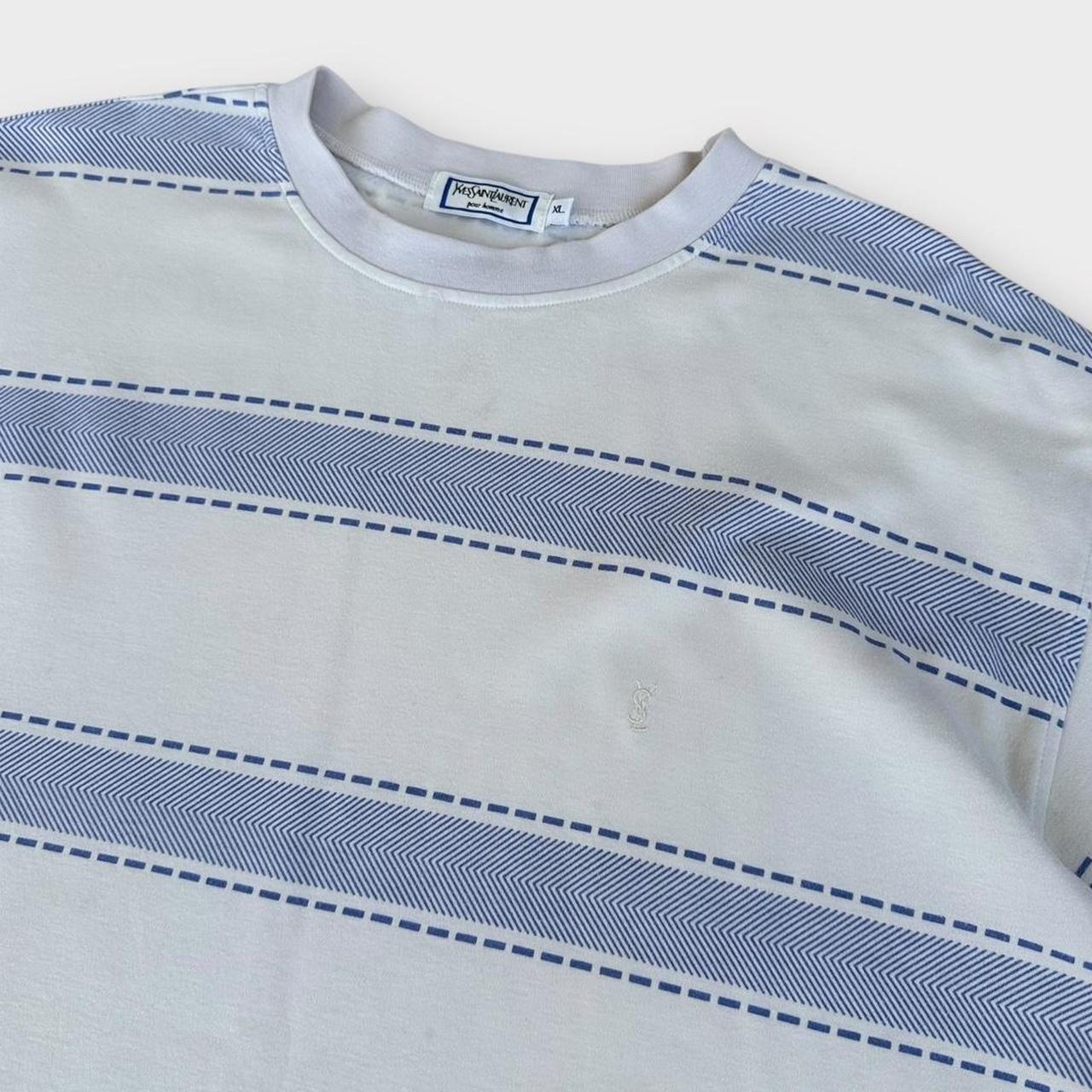 Vintage 90’s Yves Saint Laurent blue and white striped patterned tee with embroidered logo on the chest