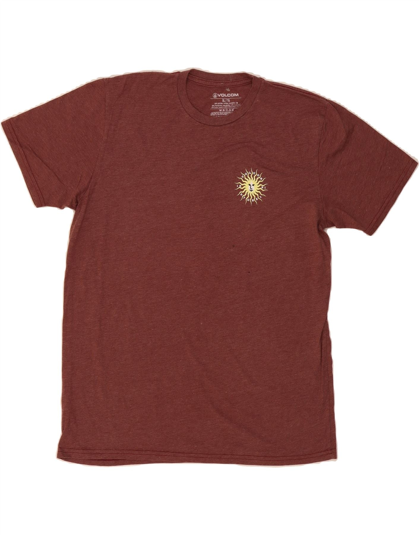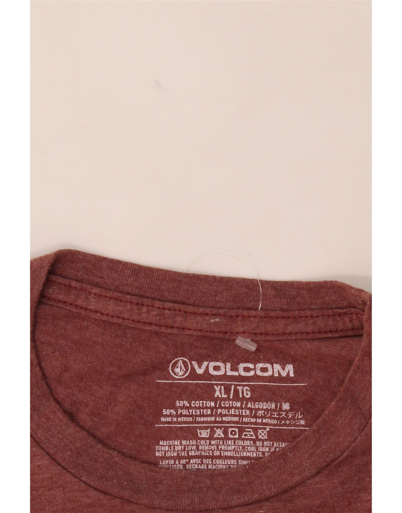 - AI Description: This pre-owned Volcom graphic T-shirt is a stylish addition to any man's wardrobe. Crafted from a comfortable cotton-polyester jersey blend, this maroon top features a classic round neck and short sleeves. The regular fit ensures a relaxed silhouette, while the bold logo adds a touch of brand appeal. The pullover closure offers ease of wear. Note: There are minor stains located on the front of the shirt below the sun graphic. Machine washable. Size XL/TG.