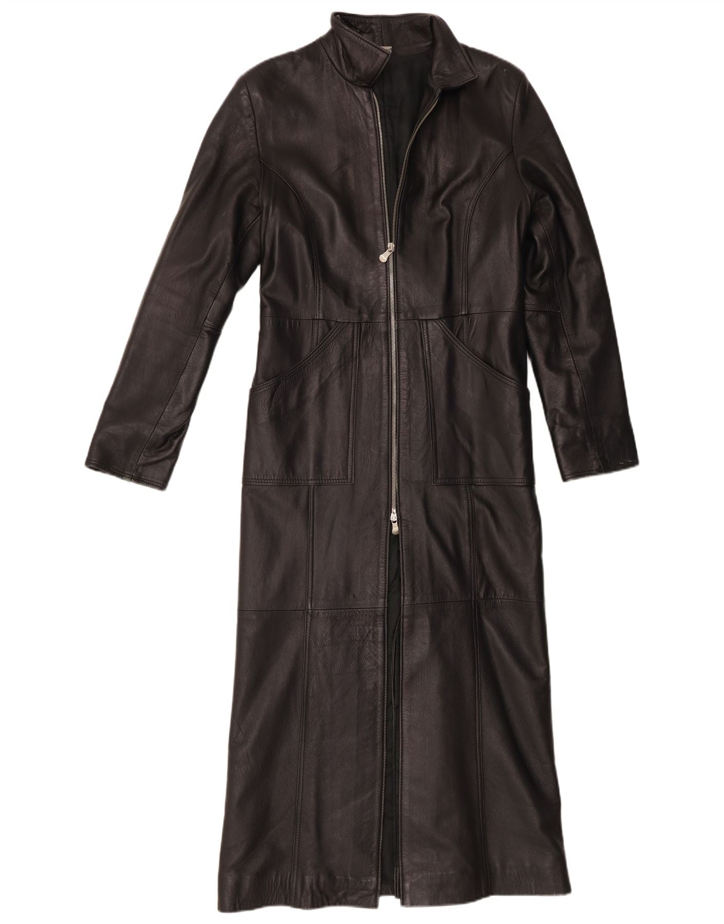 - AI Description: This Vintage womens leather coat is crafted from smooth black leather, offering a luxurious feel. It features a classic collared neckline and long sleeves. A full zip closure runs down the front, ensuring a secure fit. The coat is fully lined for added comfort and warmth. Practical pockets are integrated into the design. Its regular fit and longline cut provide an elegant, timeless silhouette.