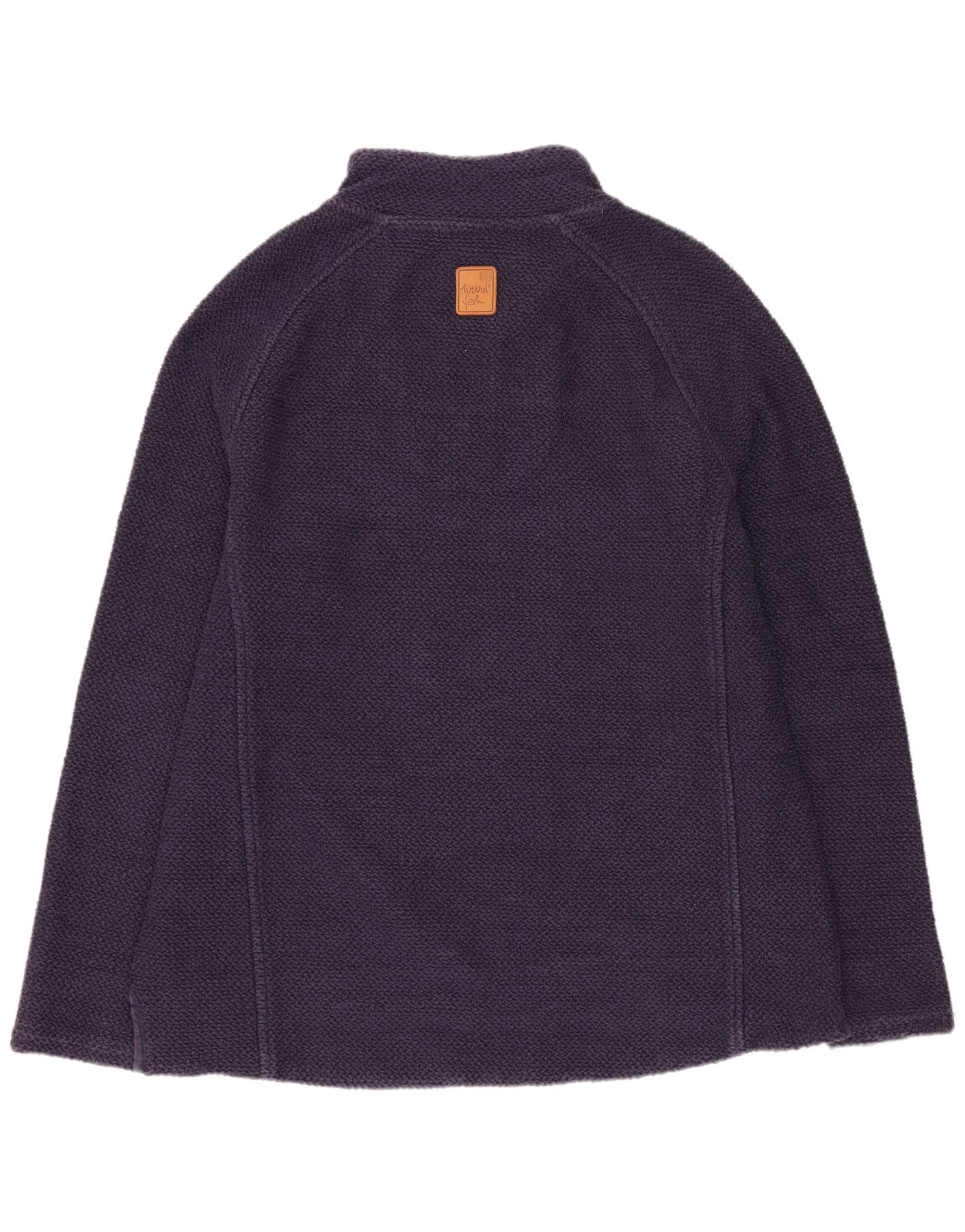 - AI Description: This Weird Fish womens Zip Neck Jumper Sweater is crafted from a rich purple cotton blend, featuring the distinctive Macaroni knit texture. It has a high neck with a practical quarter zip closure and long sleeves. The regular fit ensures comfortable wear. A contrasting patterned lining adds a playful touch to the interior. The design includes subtle branding and offers a classic, versatile style.