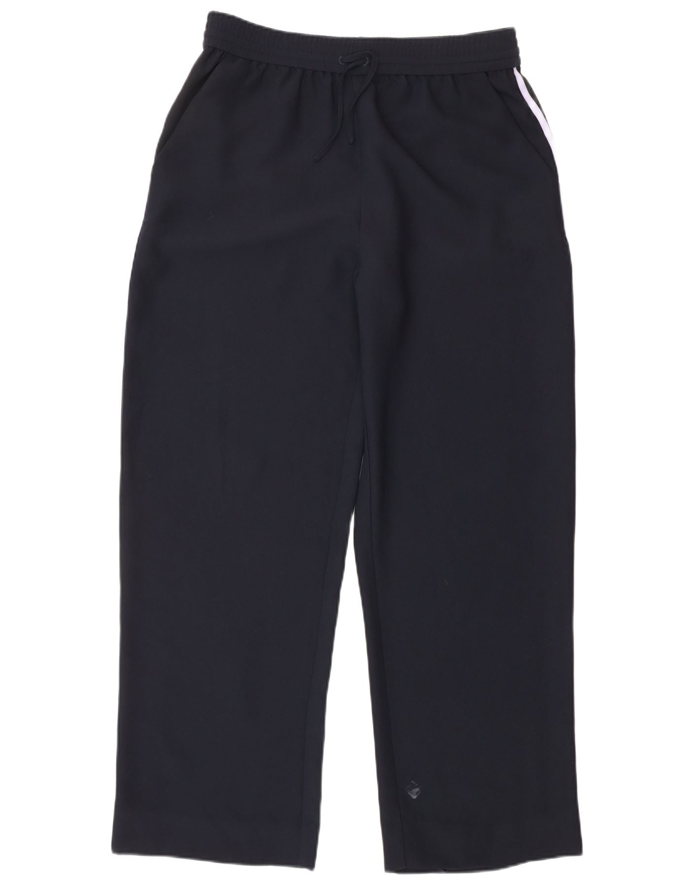 - AI Description: This Whistles womens navy blue cropped trousers are crafted from 100 percent polyester woven fabric. An elasticated waist with a drawstring closure ensures a comfortable, adjustable fit. The regular cut provides ease of movement. Practical side pockets are included. Distinctive striped detailing runs down the sides, adding a sporty aesthetic. These trousers offer both comfort and modern athletic style.