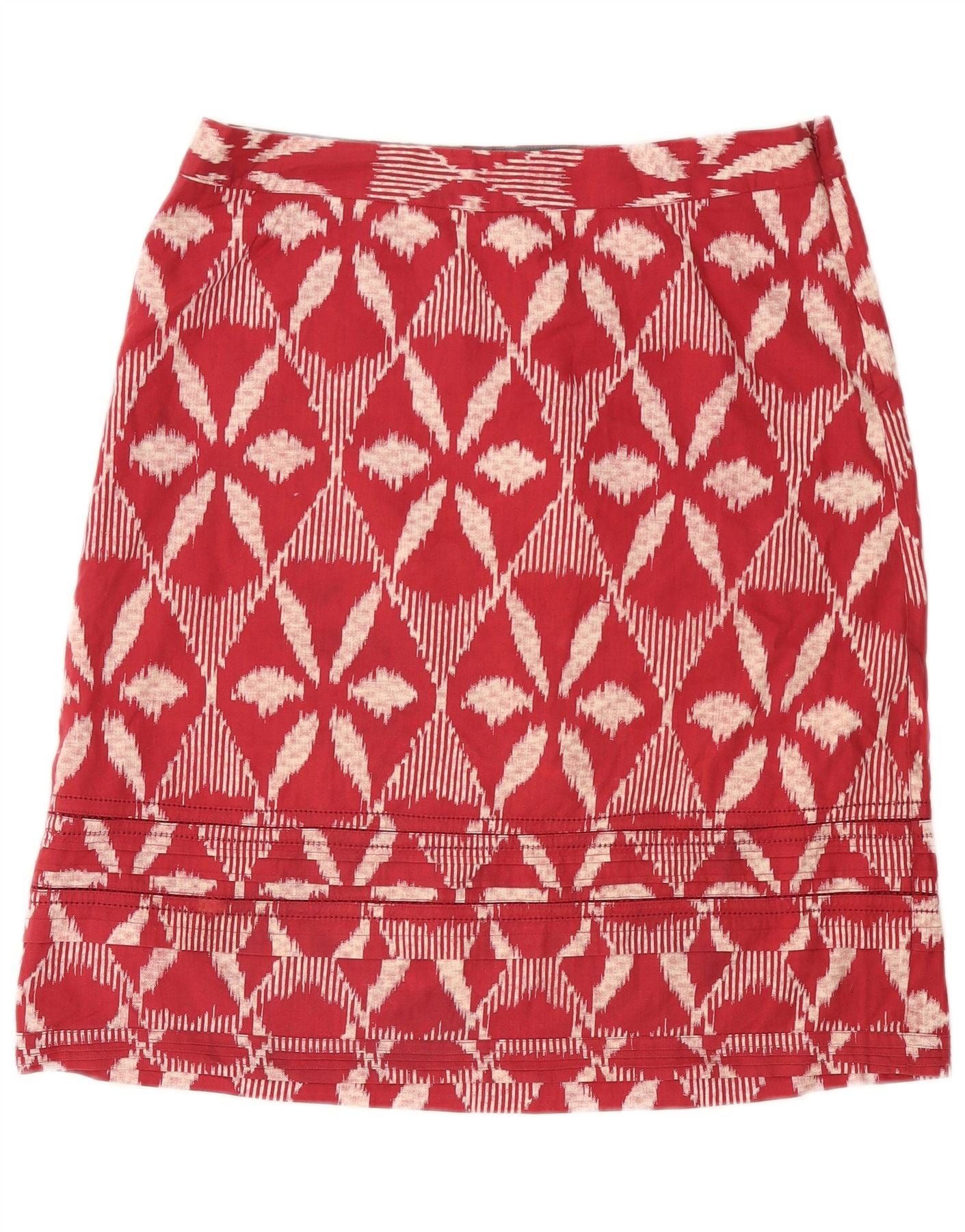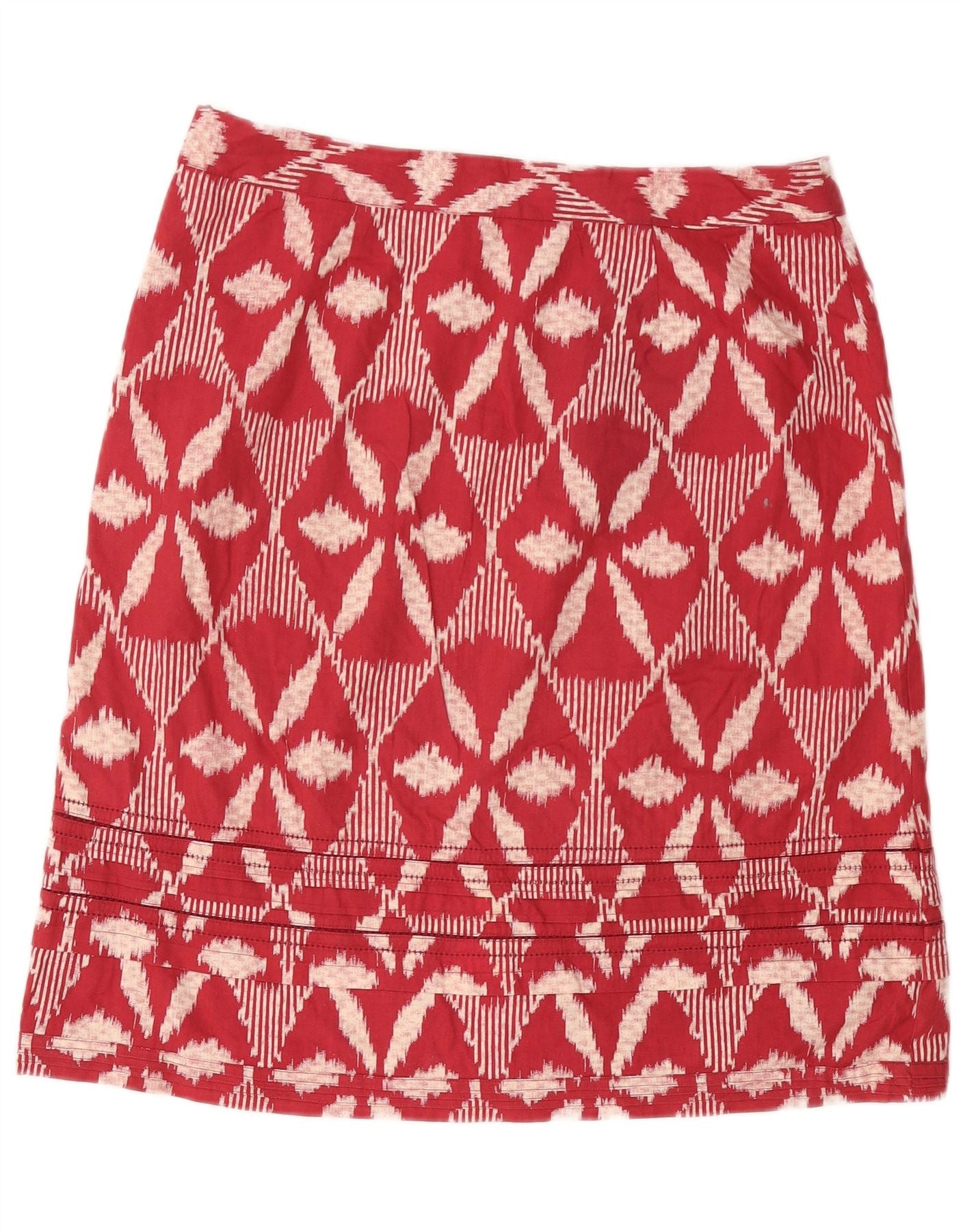 - AI Description: This White Stuff women's mini skirt features a red geometric pattern on woven cotton. The high waist and regular fit create a flattering silhouette. Its pull-on closure ensures ease of wear. The bohemian style and mini length make it a vibrant, casual piece. Crafted in India, it offers a unique, eye-catching design.