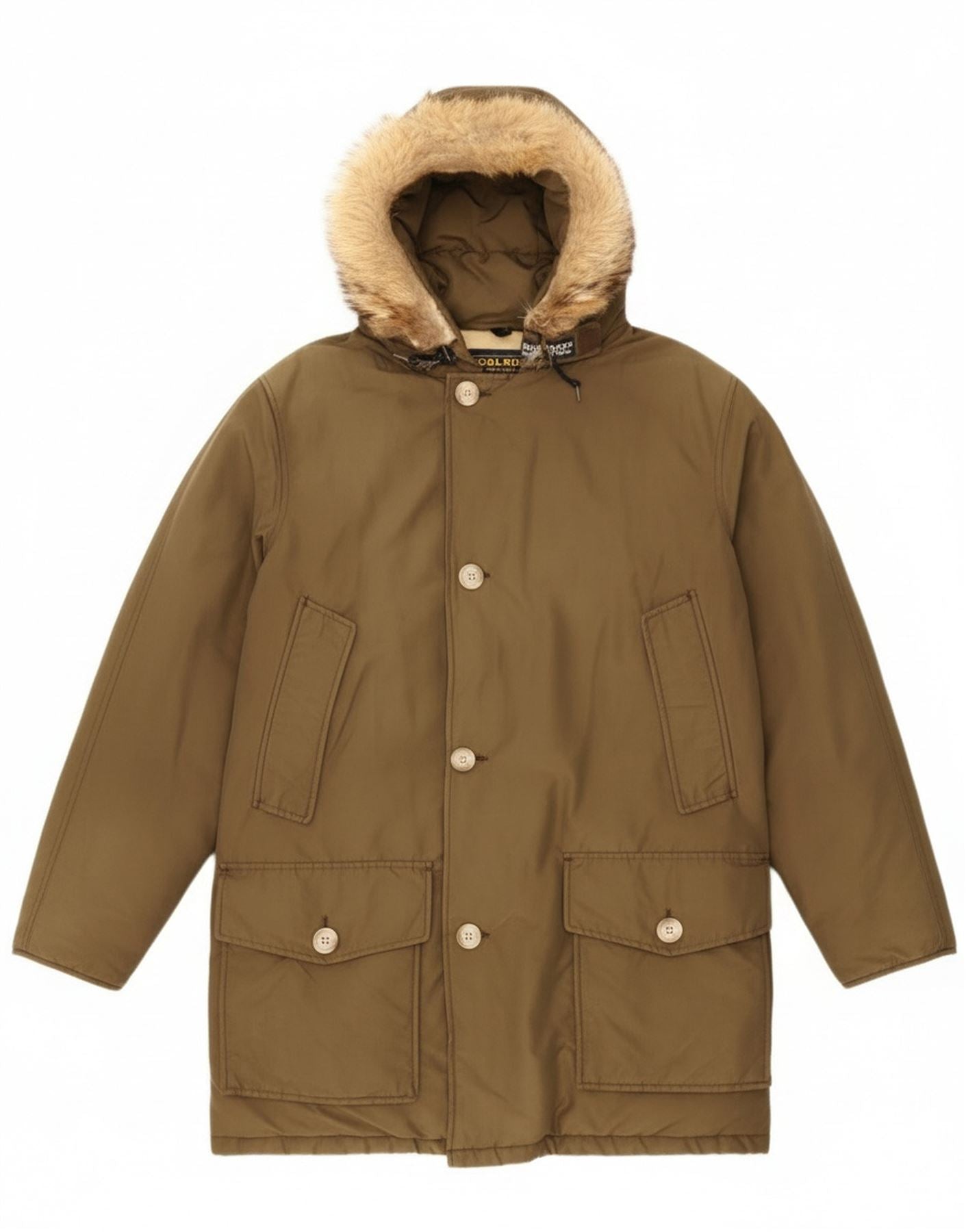 - AI Description: This Woolrich mens Parka Jacket comes in a rich brown blended fabric, offering a padded and warm feel. It features a high neck and a practical hood, complete with a faux fur trim. The long sleeves and regular fit ensure comfort. A button-up front provides secure closure. Multiple pockets add functionality. This lined jacket is ideal for winter.