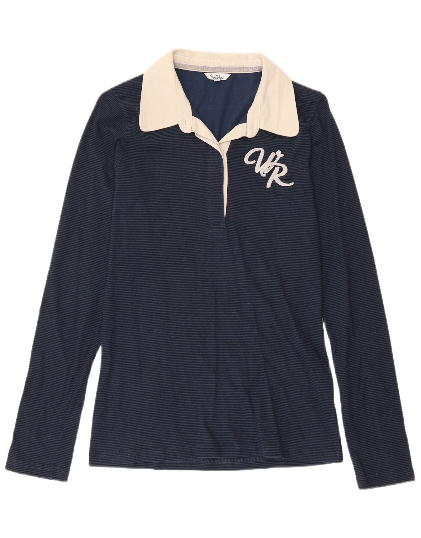 Woolrich Womens Graphic Rugby Polo Shirt UK 12 Medium Navy Blue Cotton