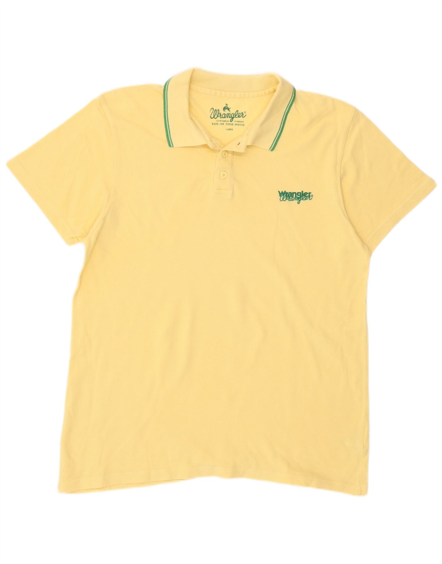 - AI Description: This Wrangler mens T-shirt is crafted from soft yellow 100 percent cotton knit fabric. It features a classic collared neckline with a subtle green stripe detail. The short sleeves and regular fit offer comfortable, timeless styling. A button closure at the neck adds a traditional touch. The embroidered Wrangler logo on the chest provides a signature accent.