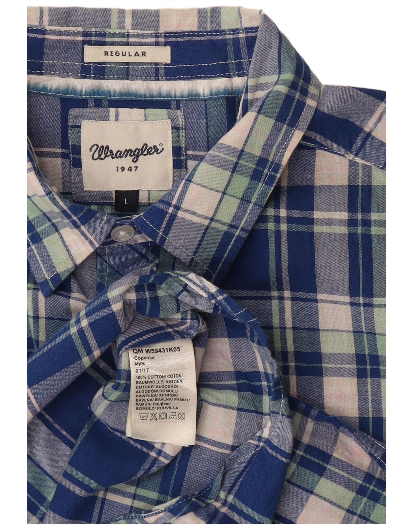 - AI Description: This Wrangler mens shirt is crafted from 100 percent cotton, offering a comfortable woven texture. It features a classic collared neckline and a full button-up front. The short sleeves and regular fit ensure a relaxed silhouette. A vibrant blue plaid pattern with green and white checks adds visual interest. Two chest pockets complete the practical, timeless design.