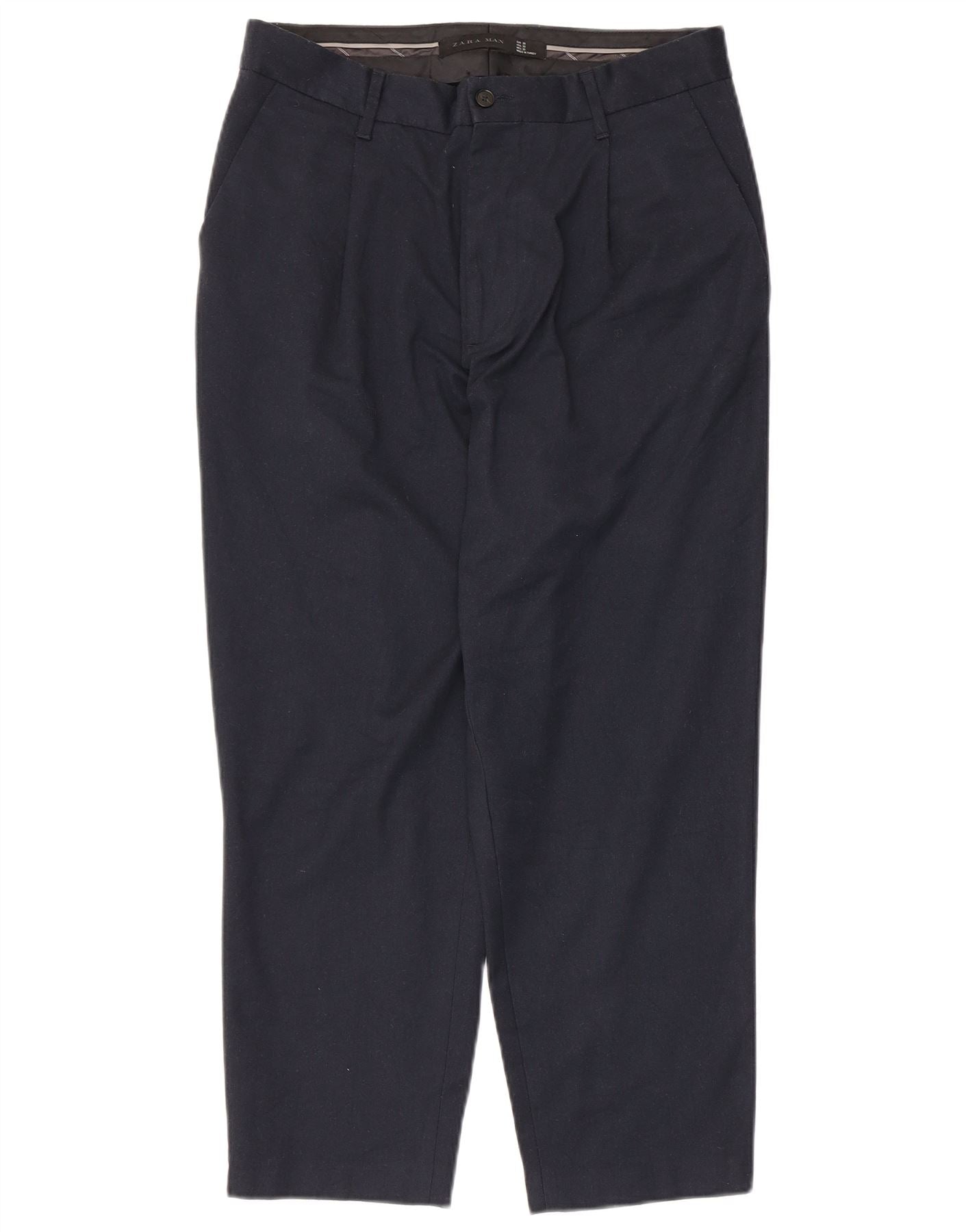 - AI Description: These Zara mens cropped trousers are crafted from a navy blue woven polyester fabric. They feature a relaxed fit with a zip closure and smart front pleats. The tapered legs offer a modern silhouette, finishing at a cropped length. Practical pockets are included for convenience. This classic style provides both comfort and contemporary appeal for everyday wear.