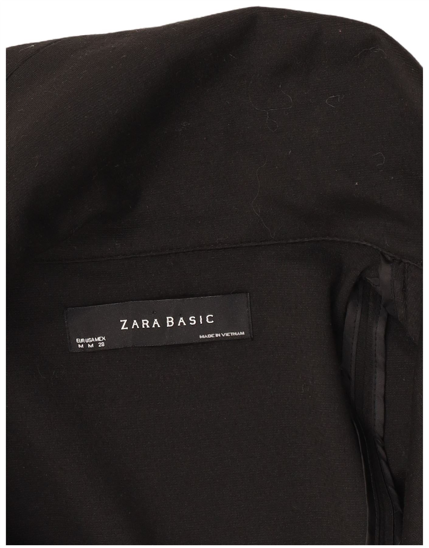 - AI Description: This Zara womens blazer jacket is crafted from a smooth black blended fabric. It features a modern collared neckline with a wide draped lapel. The long sleeves and regular fit offer a classic silhouette. A single button closure at the front creates a streamlined look. The jacket is fully lined for comfort and a refined finish, perfect for a professional ensemble.