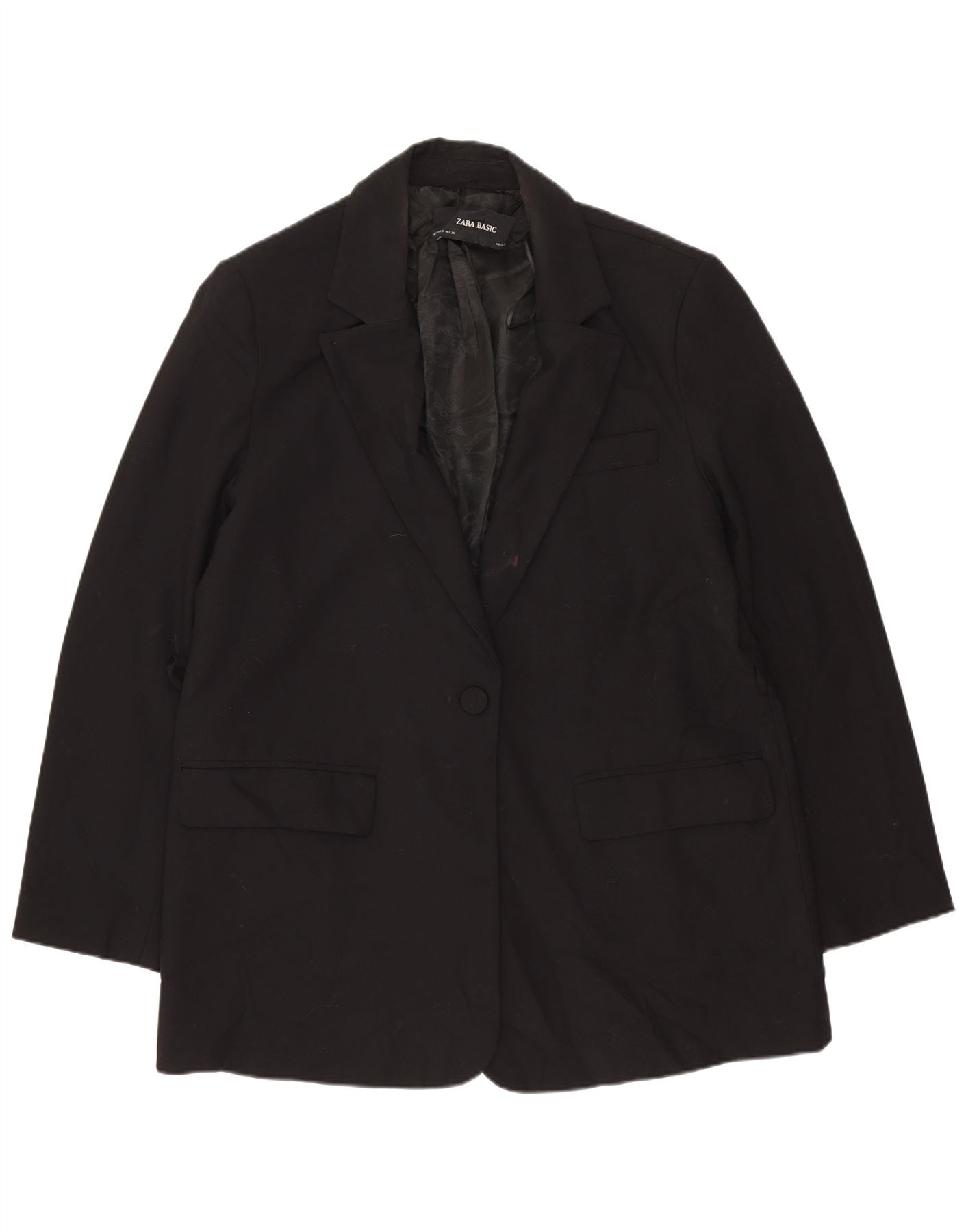 - AI Description: This Zara womens blazer jacket is crafted from a sophisticated black polyester blend fabric. It features a classic collared neckline and long sleeves. The regular fit offers a comfortable yet tailored silhouette. A single button closure at the front provides a sleek finish. Practical pockets add functional detail to this versatile piece. Its timeless style makes it perfect for professional or smart casual wear.