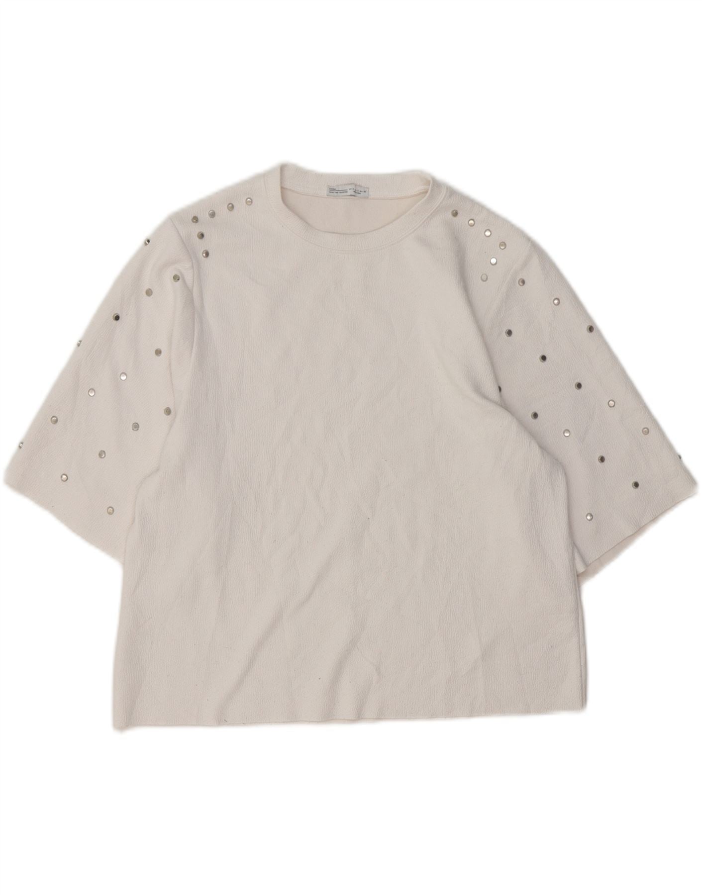 - AI Description: This Zara womens T-shirt top is crafted from an off-white textured jersey fabric. It features a classic round neckline and short sleeves. Silver-toned studs adorn the sleeves, adding a contemporary accent. The cropped length offers a modern silhouette. Its regular fit ensures comfortable wear.