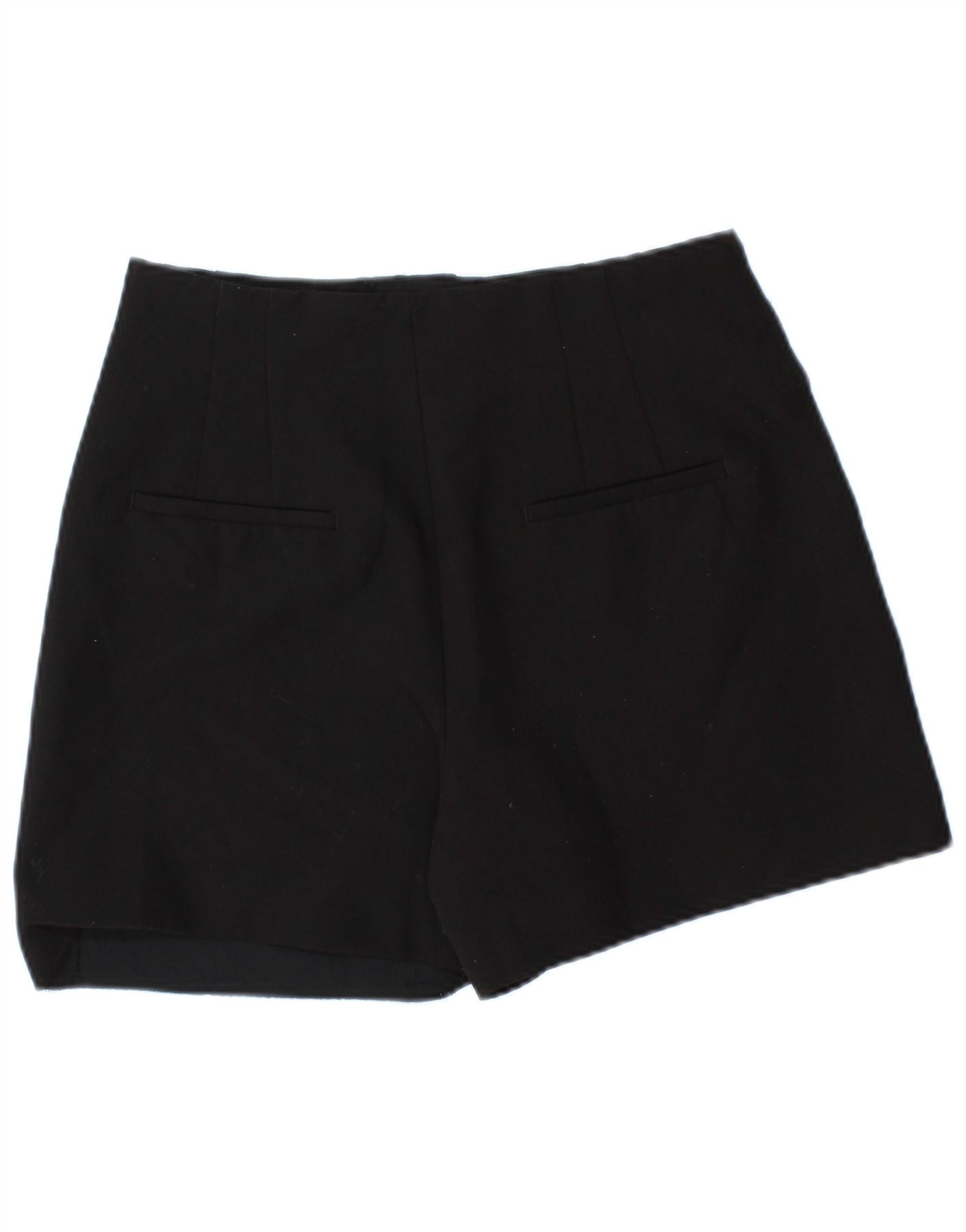 - AI Description: This Zara womens tailored shorts are crafted from a black polyester blend with added stretch for comfort. They feature a flattering high waist and a classic fit. The design includes subtle pleating and practical pockets. A neat zip closure ensures a smooth silhouette. These shorts offer a smart, versatile look for various occasions.
