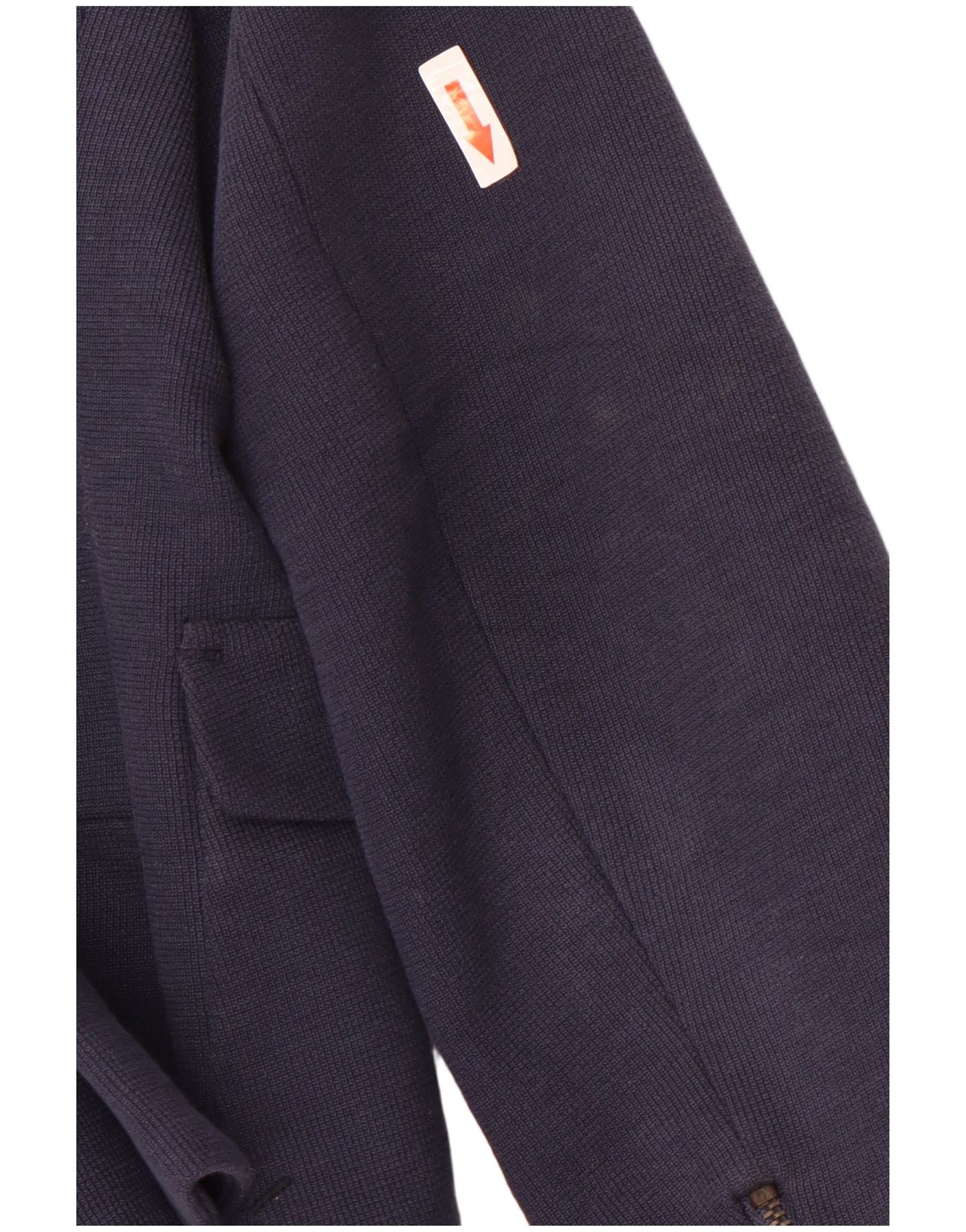 - AI Description: This Zara women's navy blue blazer is crafted from a comfortable cotton blend jersey knit, offering a soft texture with added stretch. It features a classic collared neckline and long sleeves. The single button closure creates a streamlined front. Two functional flap pockets add practicality. Its regular fit ensures a smart, versatile silhouette, ideal for a professional ensemble.