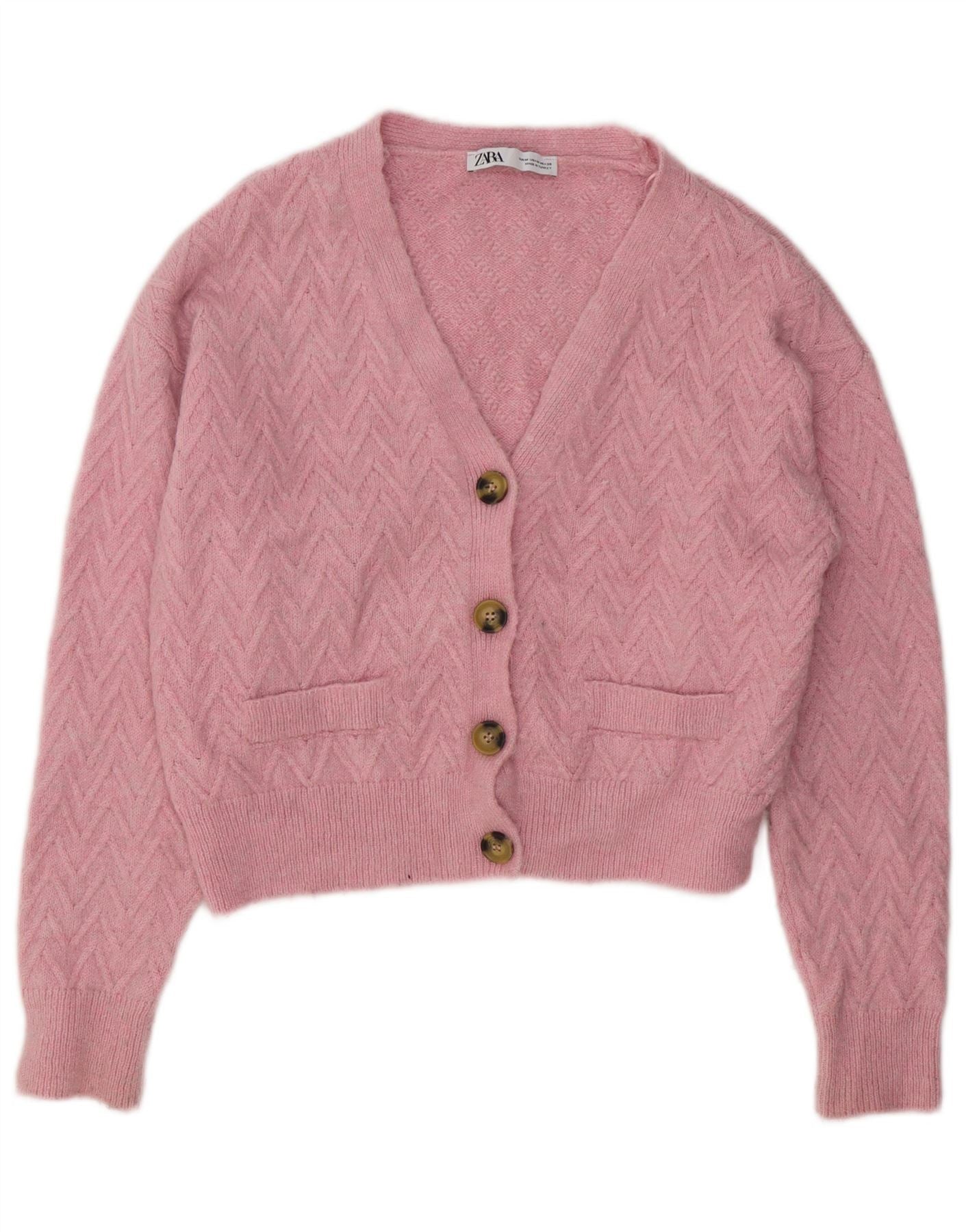 ZARA Womens Crop Cardigan Sweater UK 14 Medium Pink Chevron Acrylic