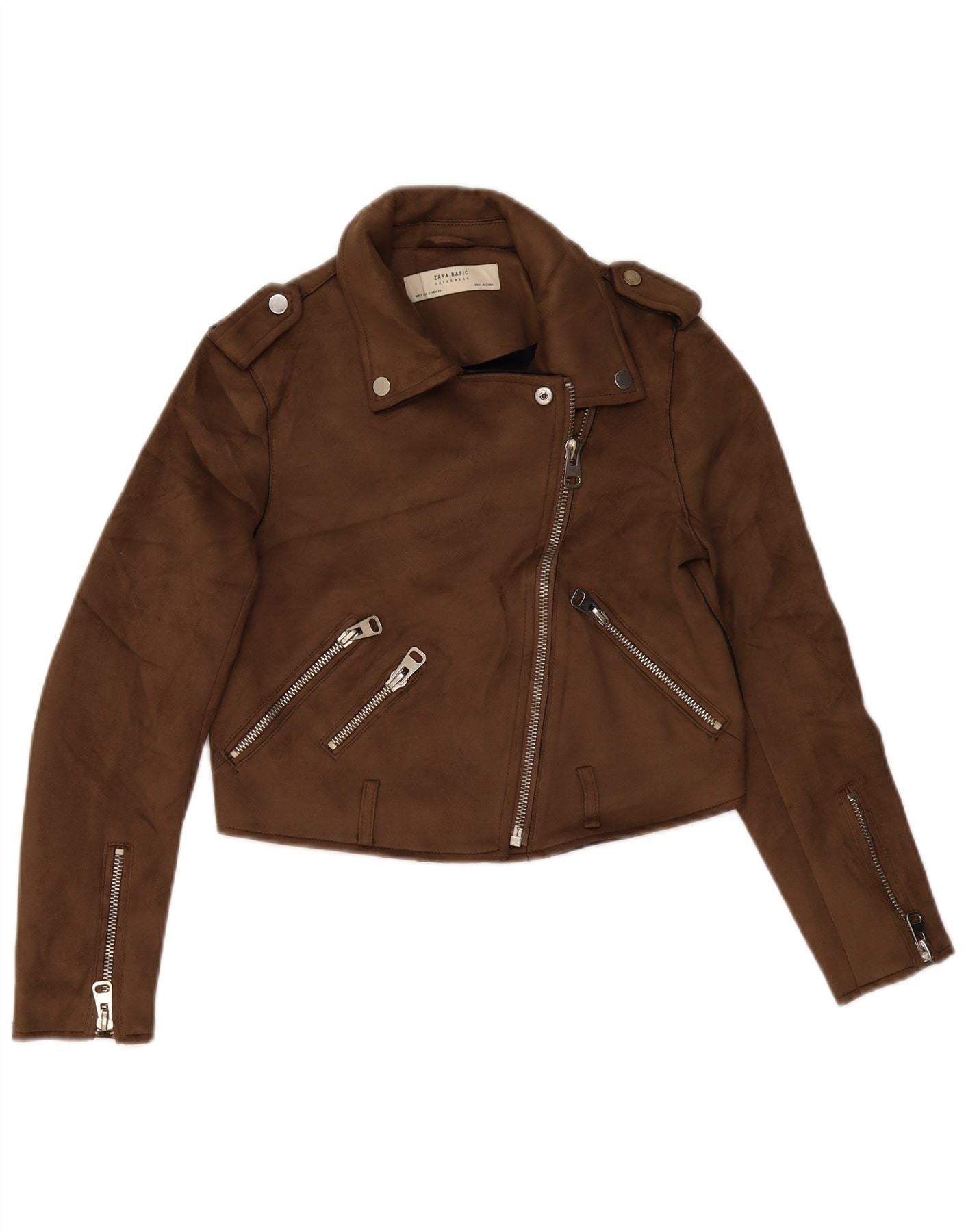 ZARA Womens Crop Faux Leather Biker Jacket UK 10 Small Brown Polyester