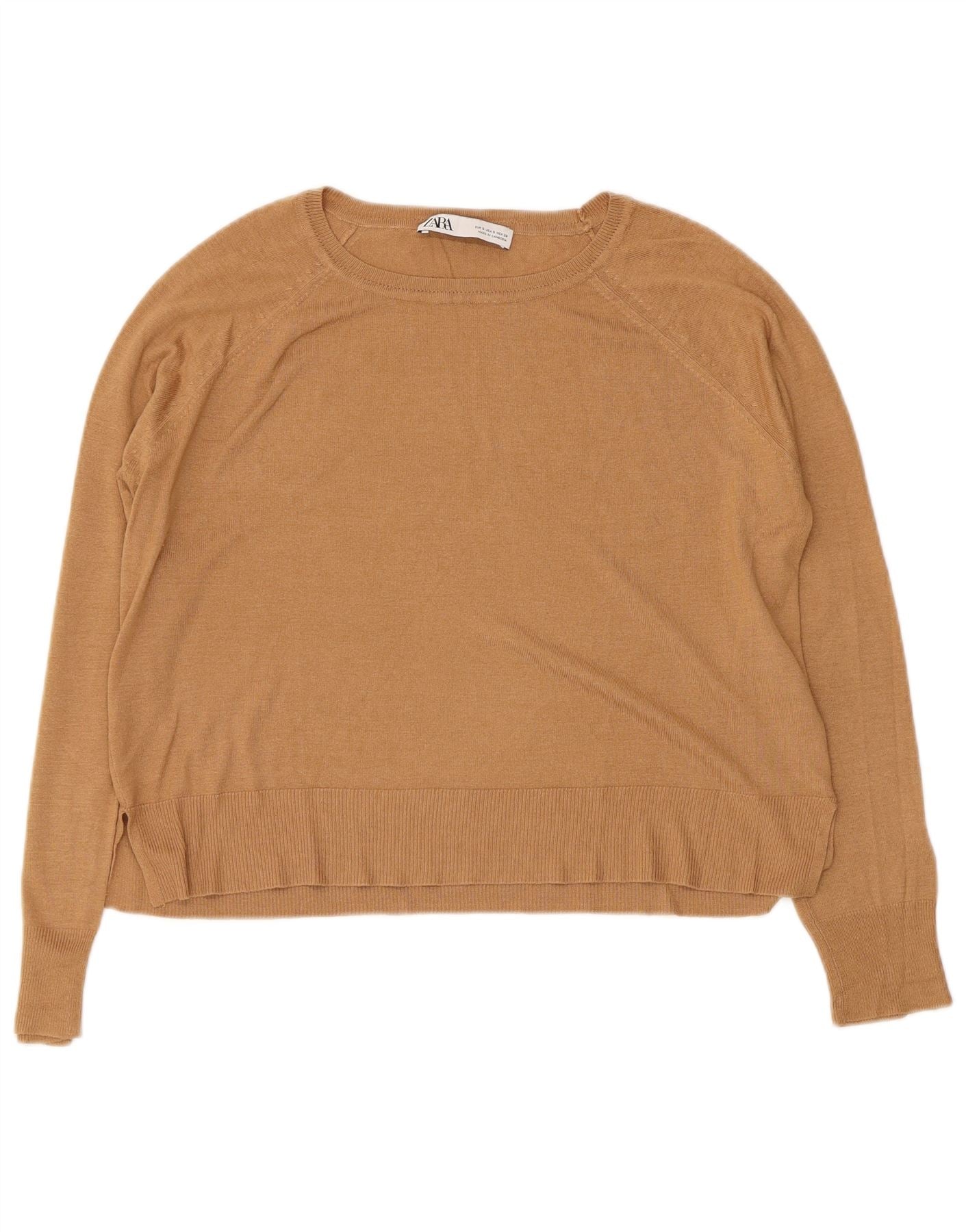 - AI Description: This Zara womens crew neck jumper sweater is crafted from a soft brown viscose blend knit. It features a classic round neckline and long sleeves with ribbed cuffs. The relaxed fit ensures comfortable wear. This pullover style offers effortless versatility. Its simple design makes it a timeless wardrobe staple with a smooth texture.