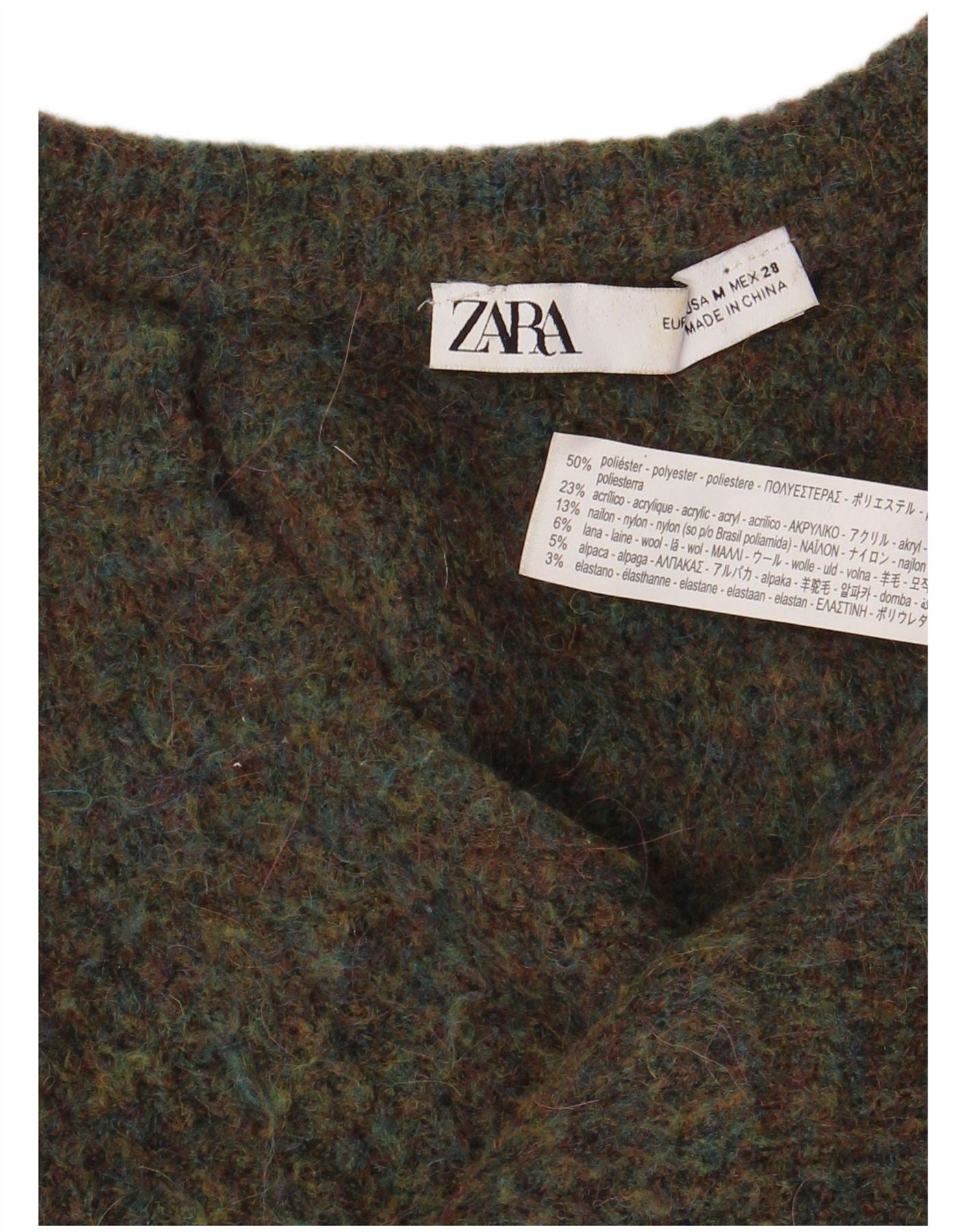 - AI Description: This Zara women's V-Neck Jumper Sweater is crafted from a soft, flecked blended fabric, offering a comfortable knit texture. It features a flattering V-neckline and short, slightly puffed sleeves. The cropped length and regular fit create a modern silhouette. The subtle flecked pattern adds visual depth, blending shades of green and brown for a sophisticated finish. It provides both stretch and comfort.