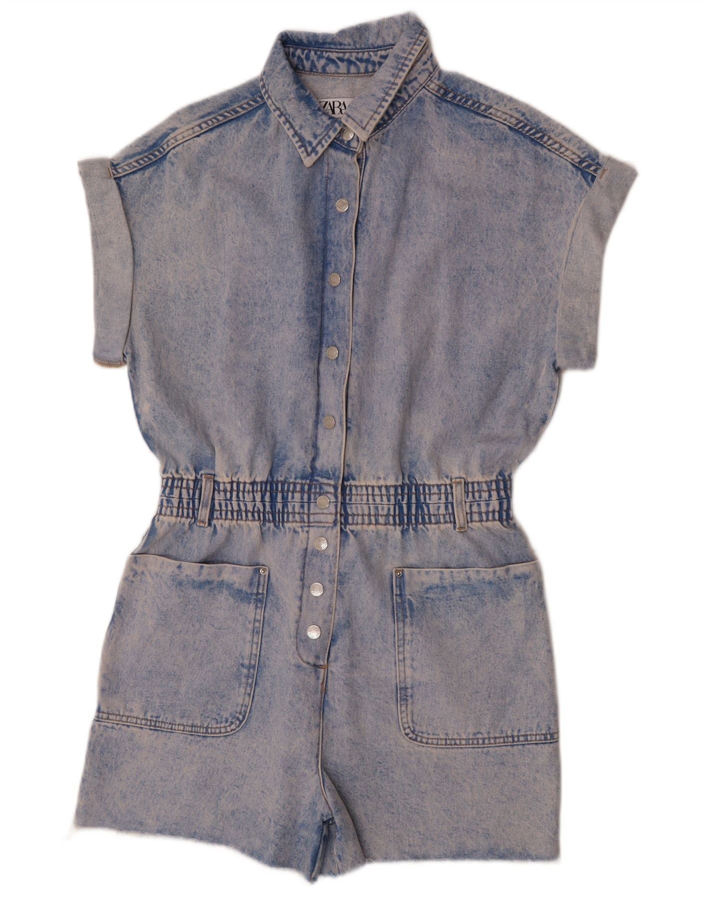 - AI Description: This Zara womens playsuit is crafted from blue denim, a blend of 98 cotton and 2 elastane. It features a collared neckline and a full button-up front. Short cuffed sleeves add a relaxed touch. An elasticated waist defines the silhouette. The relaxed fit ensures comfort. Large front pockets and rear pockets provide practical detail. Button accents complement the design.