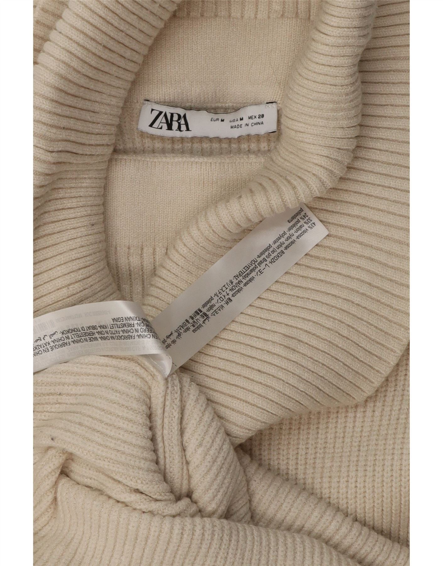 - AI Description: This Zara womens dress is crafted from a soft off white viscose knit blend. It offers comfort and stretch. The roll neck provides warmth and style. Long sleeves complete the design. Its slim fit silhouette flatters the figure. The ribbed knit texture adds subtle visual interest.