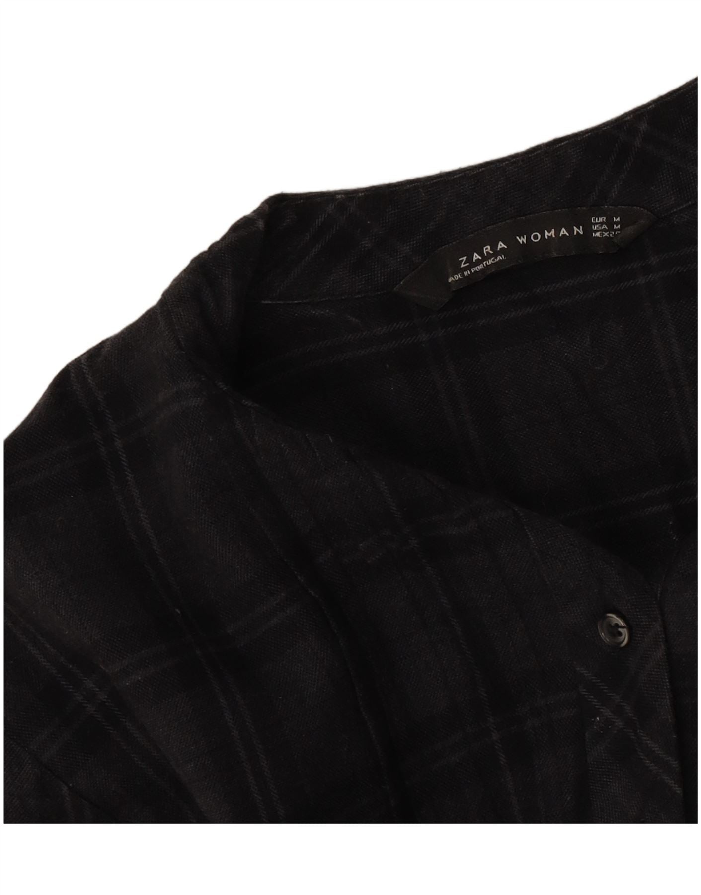 - AI Description: This Zara womens Flannel Shirt features a classic black check pattern. It is crafted from a soft woven fabric, offering a comfortable texture. The collared neckline and button-up front provide a timeless appeal. Long sleeves with cuffed details complete the design. Its relaxed fit ensures ease of wear and a casual silhouette. The check weave adds subtle visual interest.