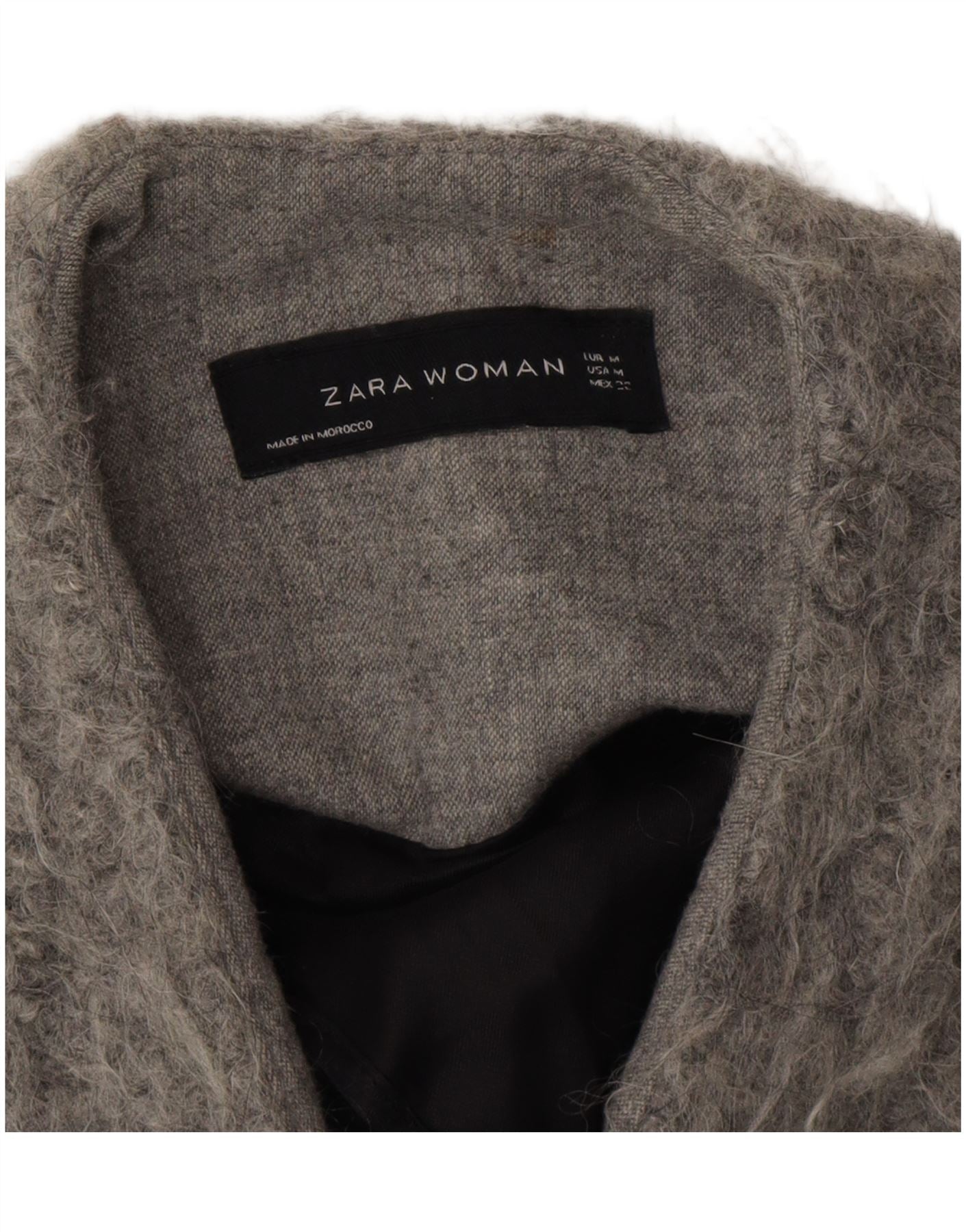 - AI Description: This Zara womens coat is crafted from a grey knit fabric with a distinctive shaggy, fur-like texture. It features a relaxed fit and a round neck. The 3/4 length sleeves add a modern touch. It is fully lined for comfort and warmth. Subtle pockets are integrated into the design. The front closure is secured with discreet snaps. This stylish piece offers both warmth and contemporary elegance.