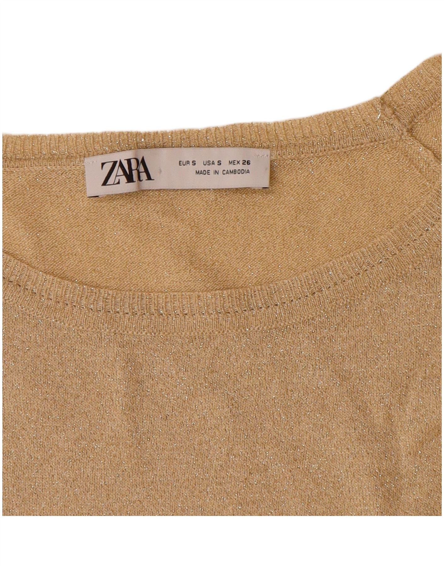 - AI Description: This Zara mens crew neck jumper sweater is crafted from a lightweight knit fabric in a shimmering gold hue. It features a classic round neckline and long sleeves. The pullover design offers easy wear. A regular fit ensures comfortable movement. Subtle glitter detailing gives the knit a modern, refined finish.