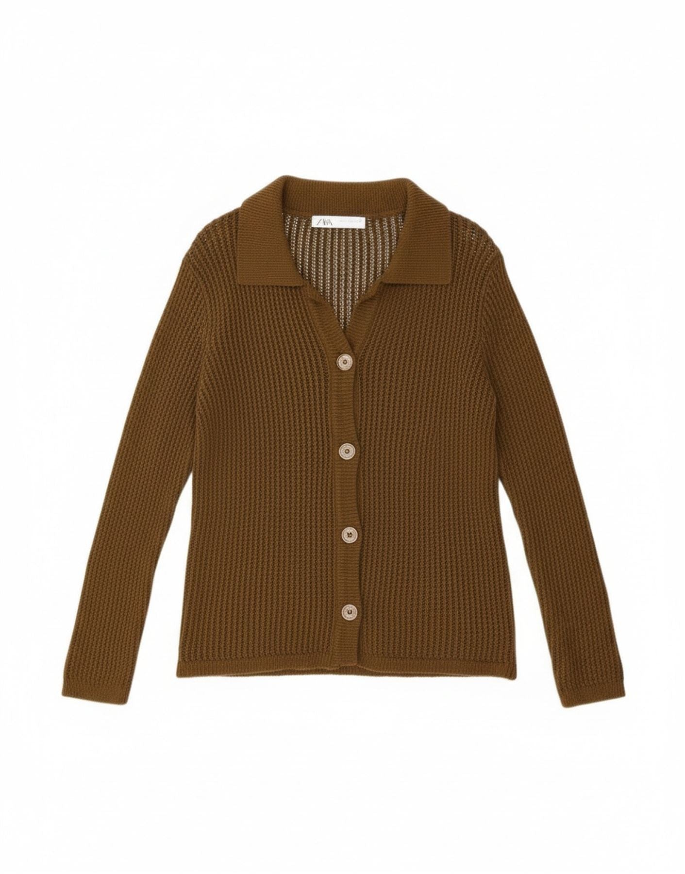 - AI Description: This Zara women's cardigan sweater is crafted from a brown, open knit fabric, offering a textured yet lightweight feel. It features a classic collared neckline and long sleeves. The button-up front provides a versatile closure. Tonal buttons run down the front, adding subtle detail. Its regular fit ensures comfortable wear, making it a versatile layering piece.