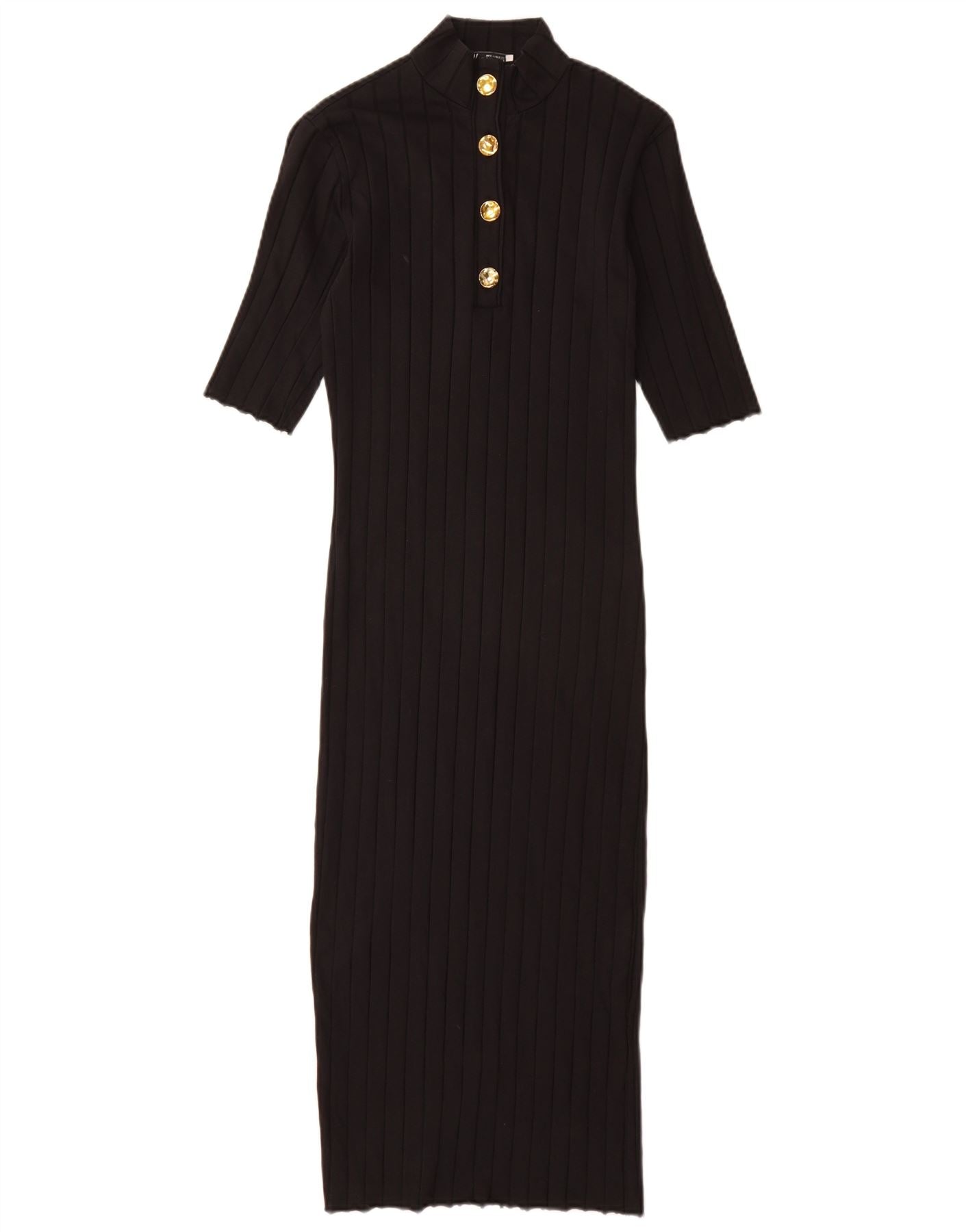 - AI Description: This Zara womens bodycon dress is crafted from a black ribbed knit fabric, offering stretch and comfort. It features a sophisticated mock neck and short sleeves. The slim fit accentuates the silhouette. Gold-tone buttons adorn the front, adding a classic accent. This dress combines timeless style with modern tailoring.