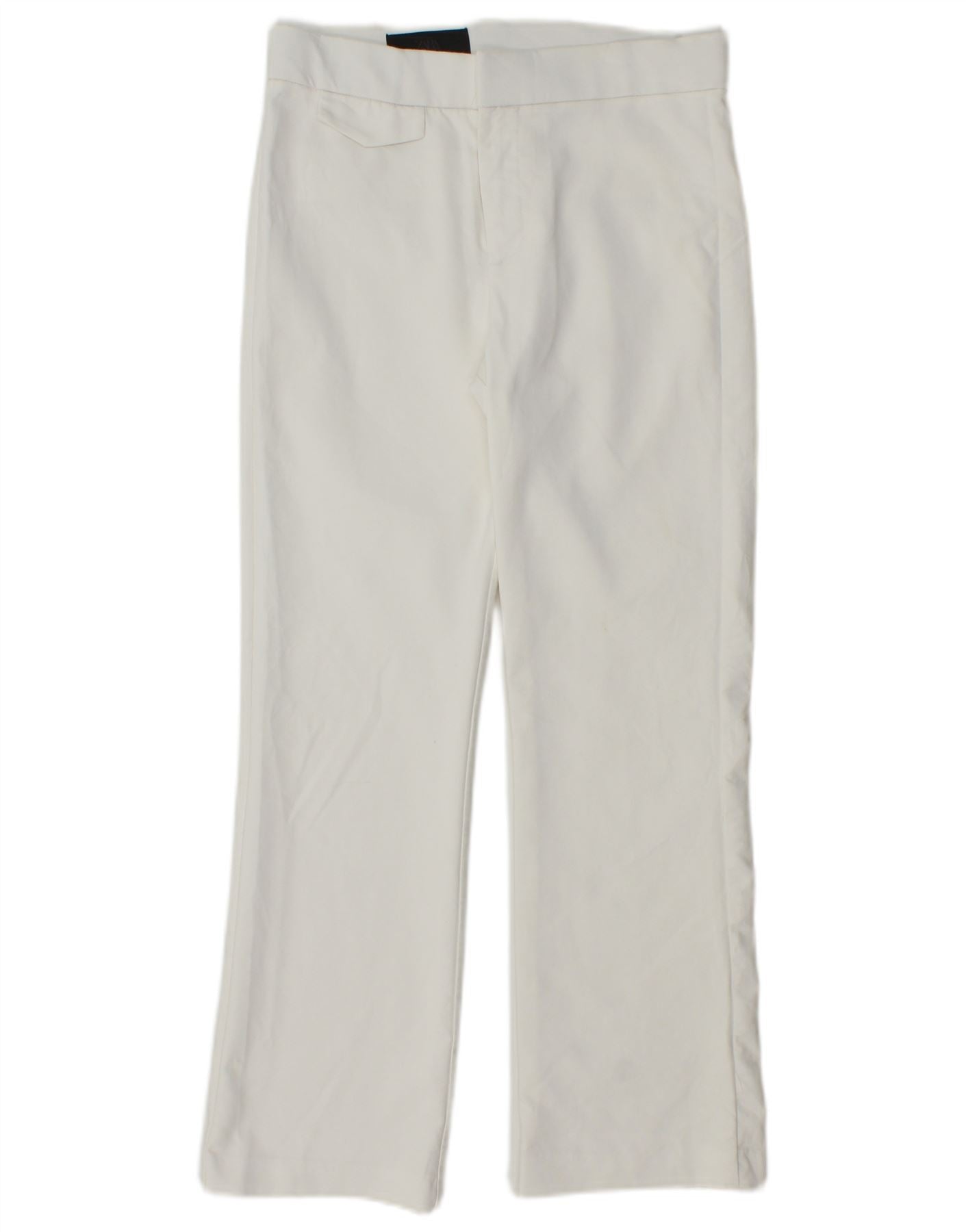 - AI Description: This Zara womens cropped trousers are crafted from a crisp white woven fabric. They feature a comfortable high waist and a pull-on design, ensuring a smooth silhouette. The legs offer a regular fit, gently flaring into a bootcut style at the cropped hem. This classic design provides a clean, modern aesthetic, perfect for versatile styling.