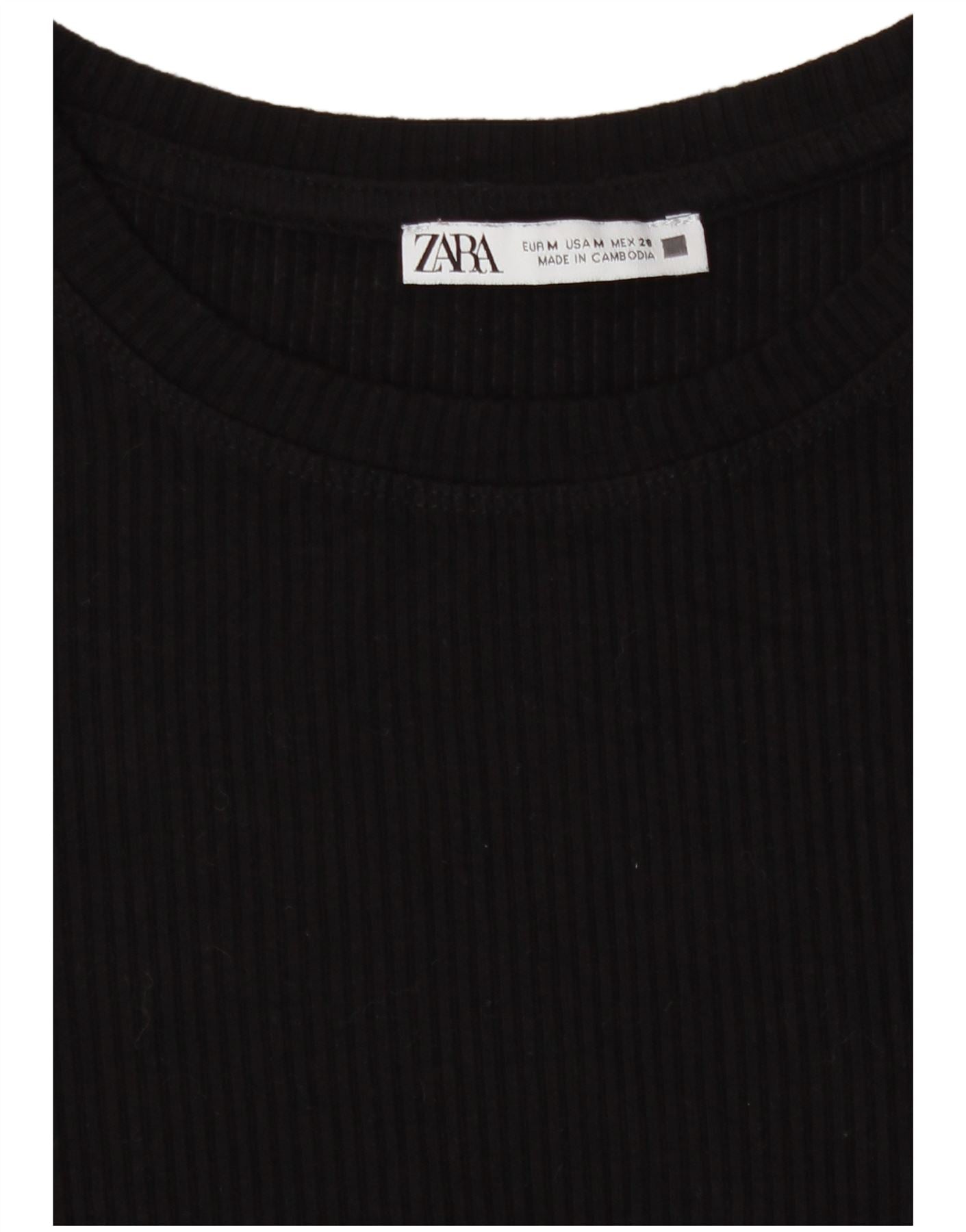- AI Description: This Zara womens T-shirt top is crafted from a comfortable black ribbed knit fabric. It offers a soft feel with added stretch for comfort. The classic round neckline and short sleeves provide a timeless silhouette. It features a regular fit, ensuring ease of wear. The ribbed texture adds subtle visual interest to this modern basic, making it a versatile wardrobe staple.